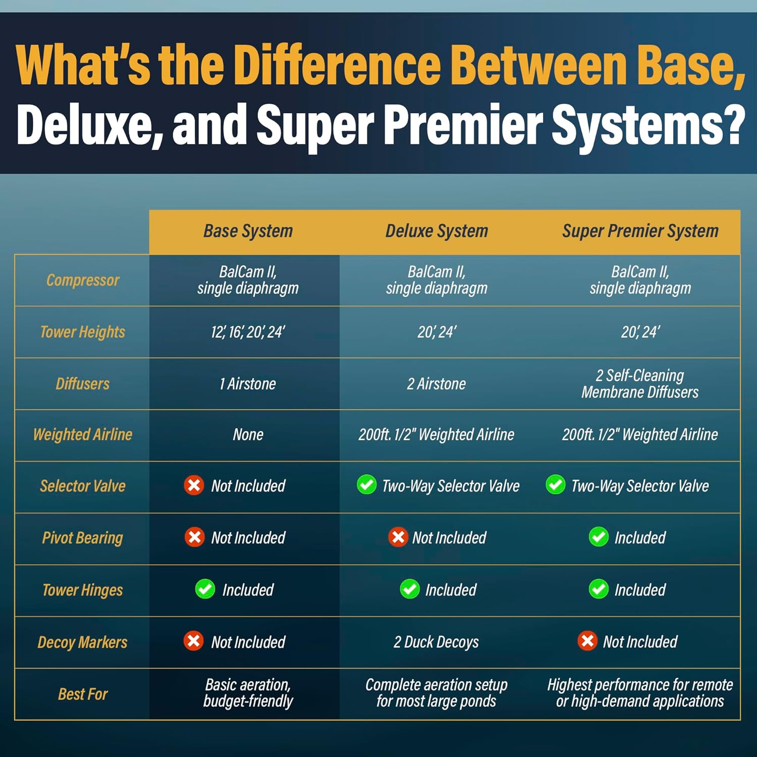 - AERATES PONDS UP TO 1 ACRE IN SIZE: Effective even in low-wind areas, this system oxygenates ponds to prevent stratification, reduce fish kills, and support aquatic life.
