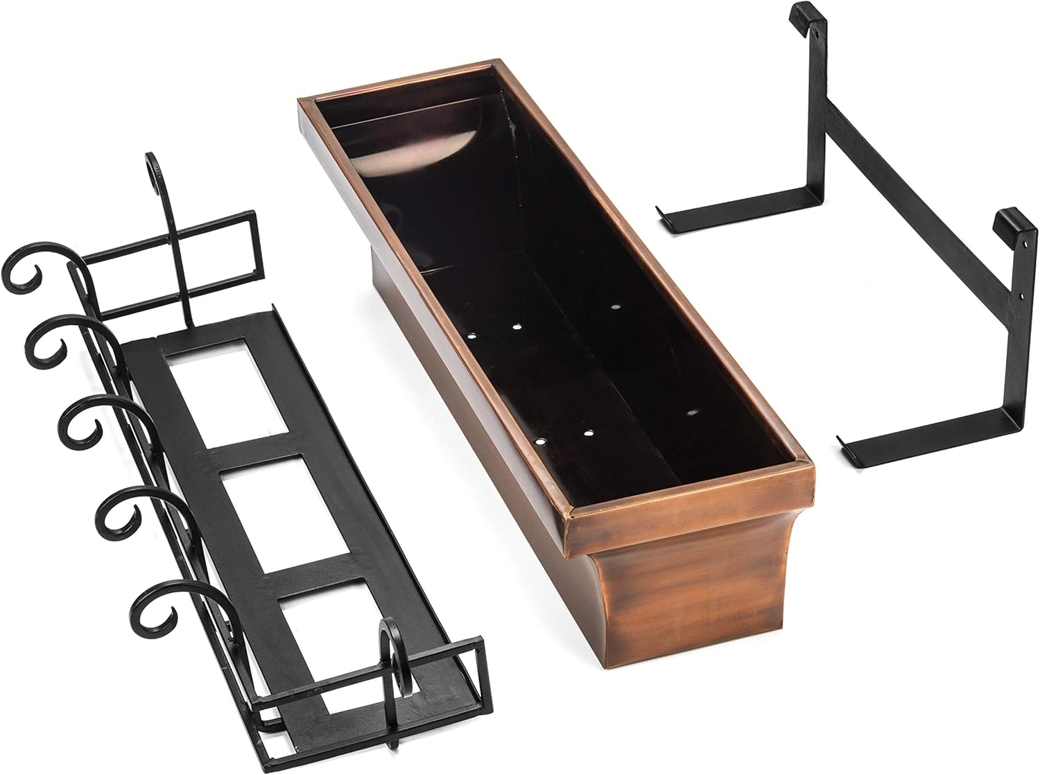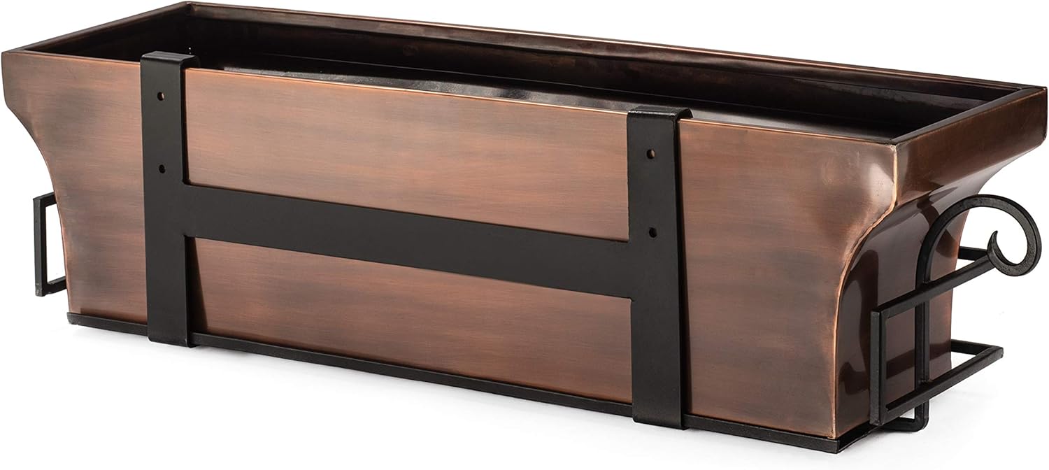 - Sturdy window boxes for the home – The rich color of this flared window box adds an extra layer of depth to any outdoor decor. The antique copper finish is perfectly paired with the black powder coat of the frame, and is accentuated by the scroll work on the frame. The wide mouth at the top of the window flower box allows your flowers to breathe and grow throughout the box. The sturdy but lightweight design allows the easy to remove brackets to functionally support the window box.