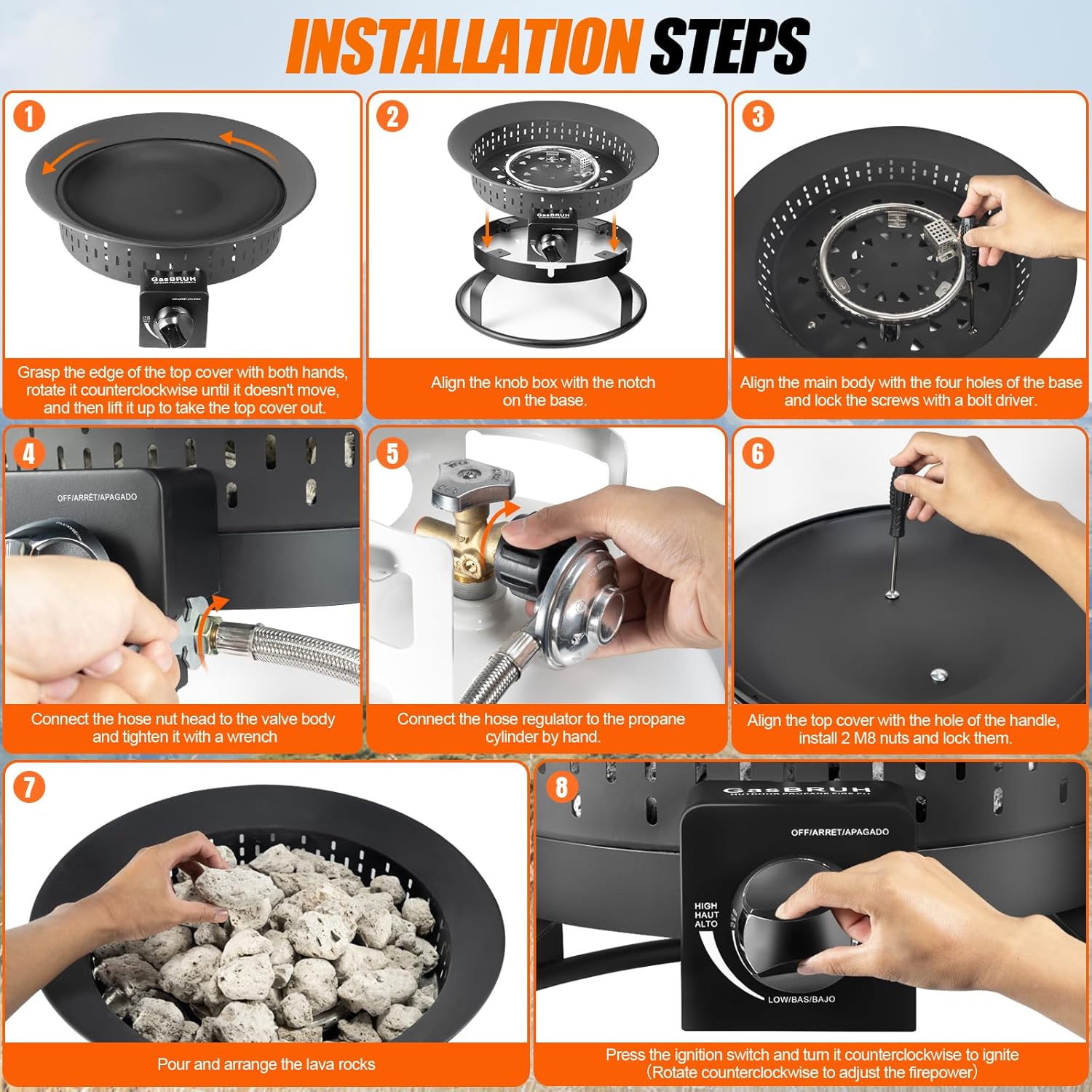 - .Easy & Safe to Use Gas Fire Pit: GasBRUH portable fire pit easily sets up in minutes and features advanced piezo ignition technology for easy and safe lighting. The fire pit gas included braided stainless steel regulator hose with a CSA-certified resists damage from flames and animals, helping to prevent gas leaks and ensure safety during use.