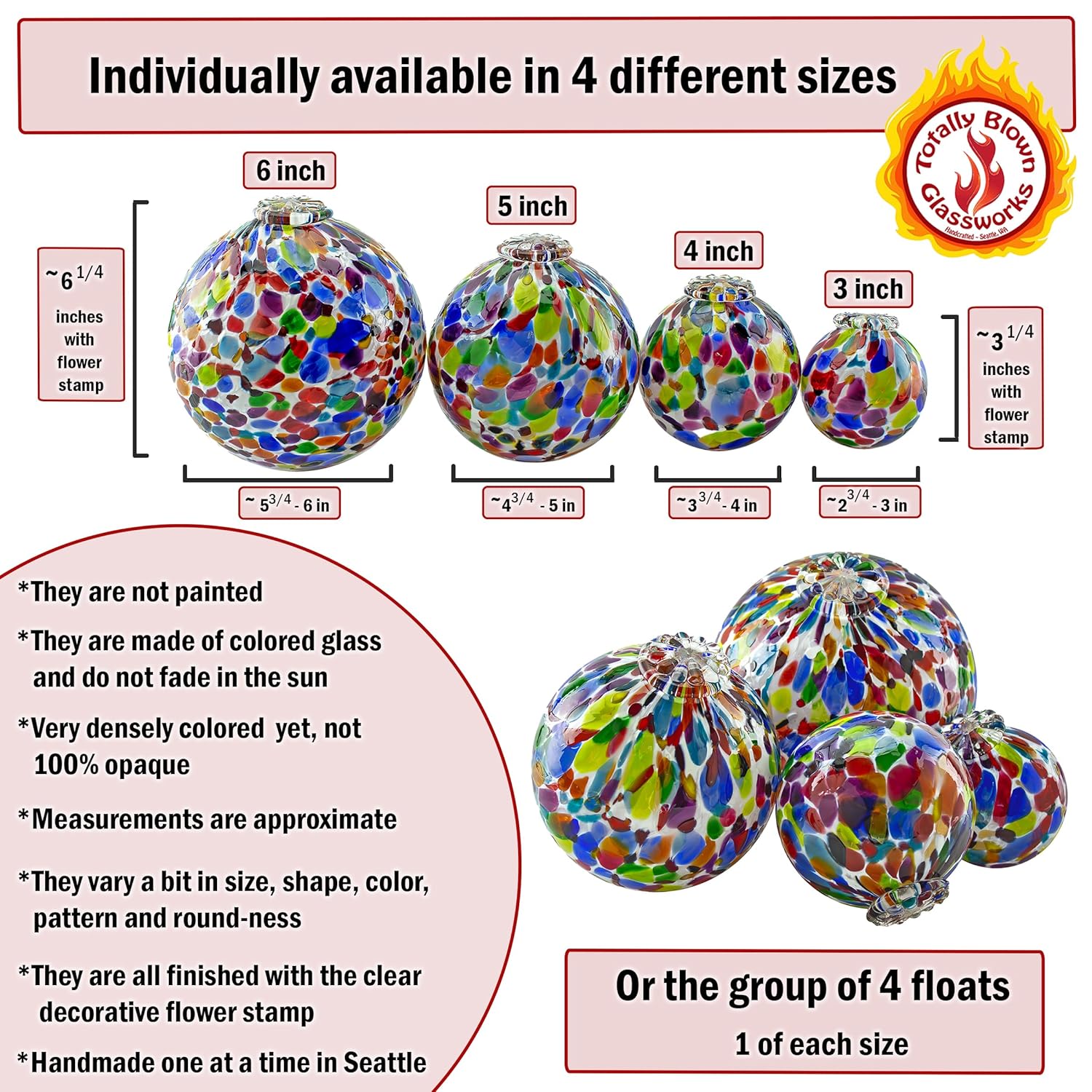 - Dimensions: The glass balls range from approximately 3 to 6 inches in diameter. Available in 4 sizes and 20 different colors.