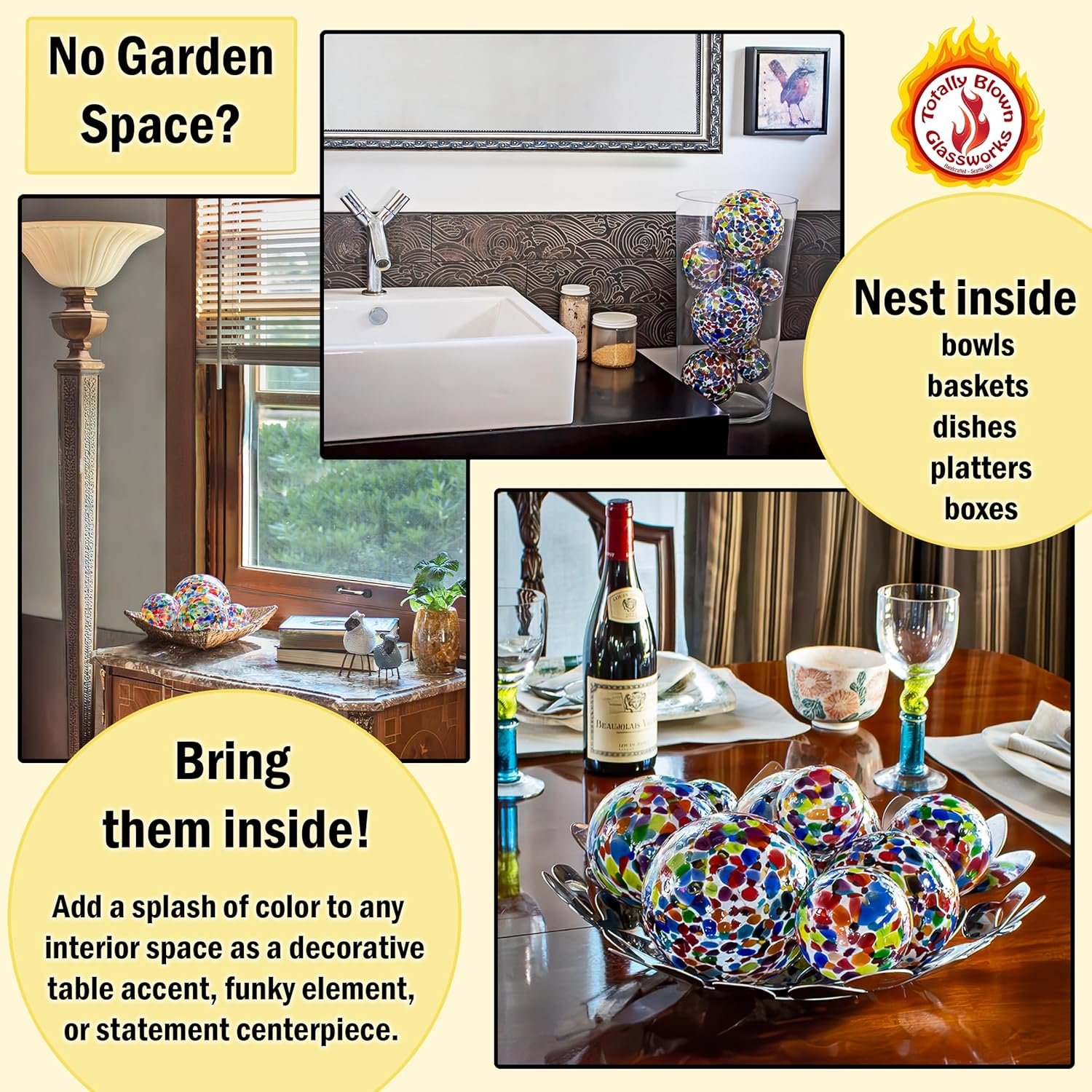 - Vibrant Handmade Glass Spheres: Beautifully crafted blown glass balls in a variety of vivid color, patterns, and sizes. Colorful addition to your home, patio, garden or water feature.