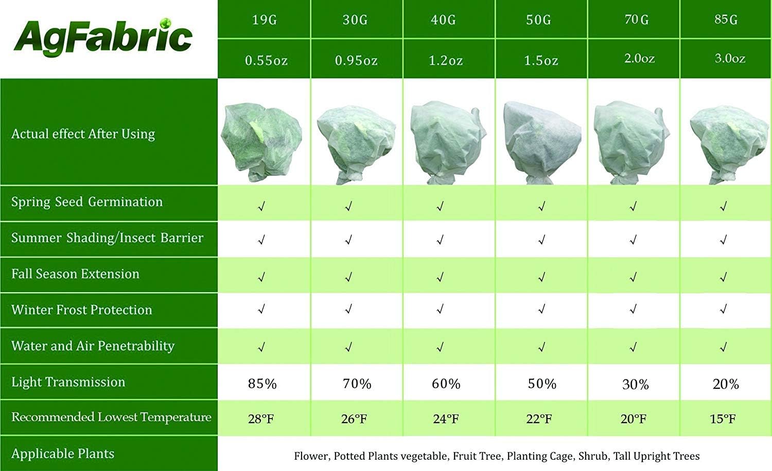 - SUITABLE SIZE Perfect for Greenhouse size 130''high and 115''wide, Heavy-weight FRCs (.9-1.2 oz./sq. yard): Are usually used to extend the growing season in spring and fall, allow 30%-50% light transmittance, and recommend 3°-8°F. of frost protection.