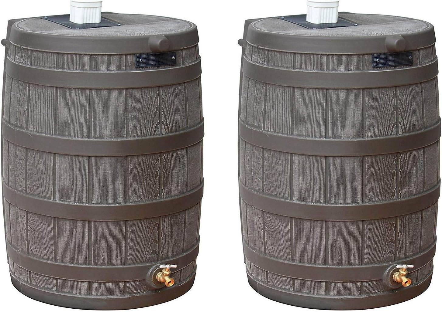 Good Ideas 50 Gallon Large Faux Wood Plastic Rain Water Barrel Collector with Brass Spigot for Rainwater Collection and Storage, Oak, 2 Pack