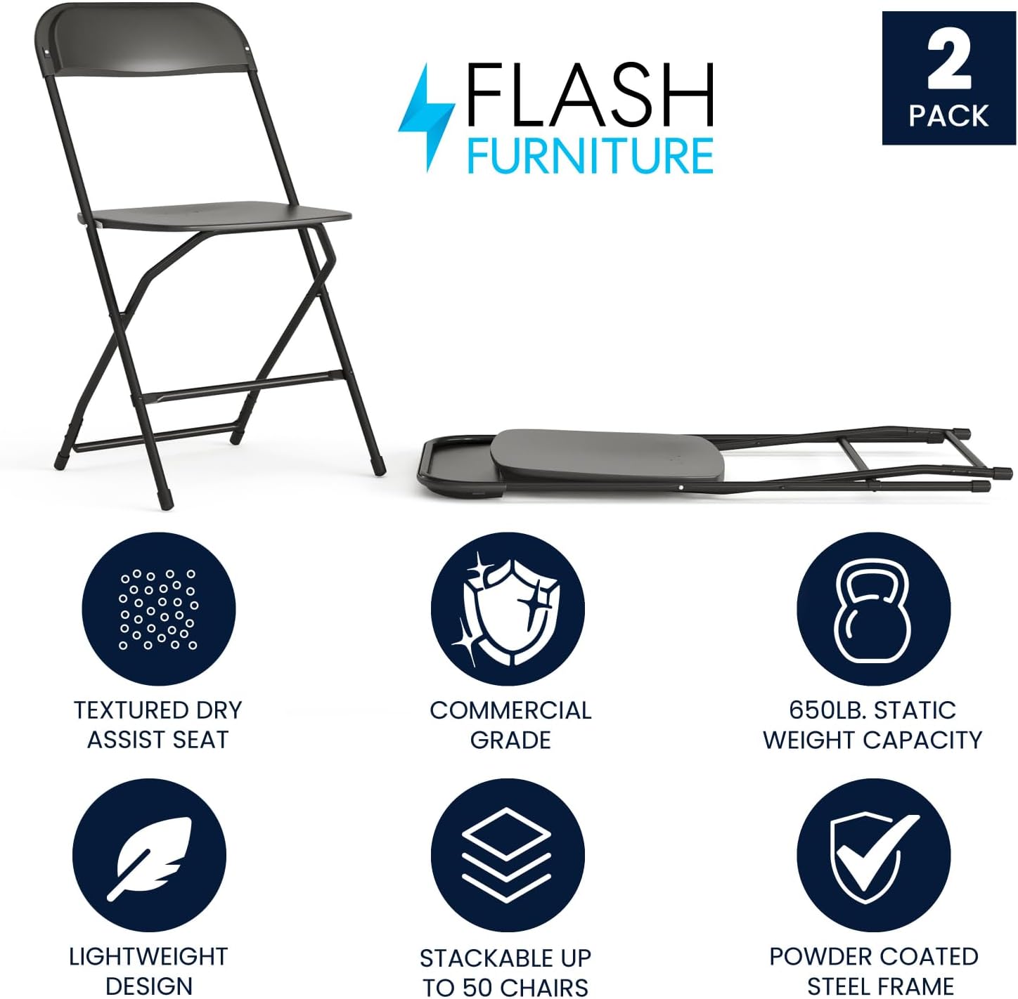 Flash Furniture Hercules Series Plastic Folding Chairs for Parties and Weddings, Stackable Commercial Event Seats with 650-lb. Static Weight Capacity, Set of 2, Black