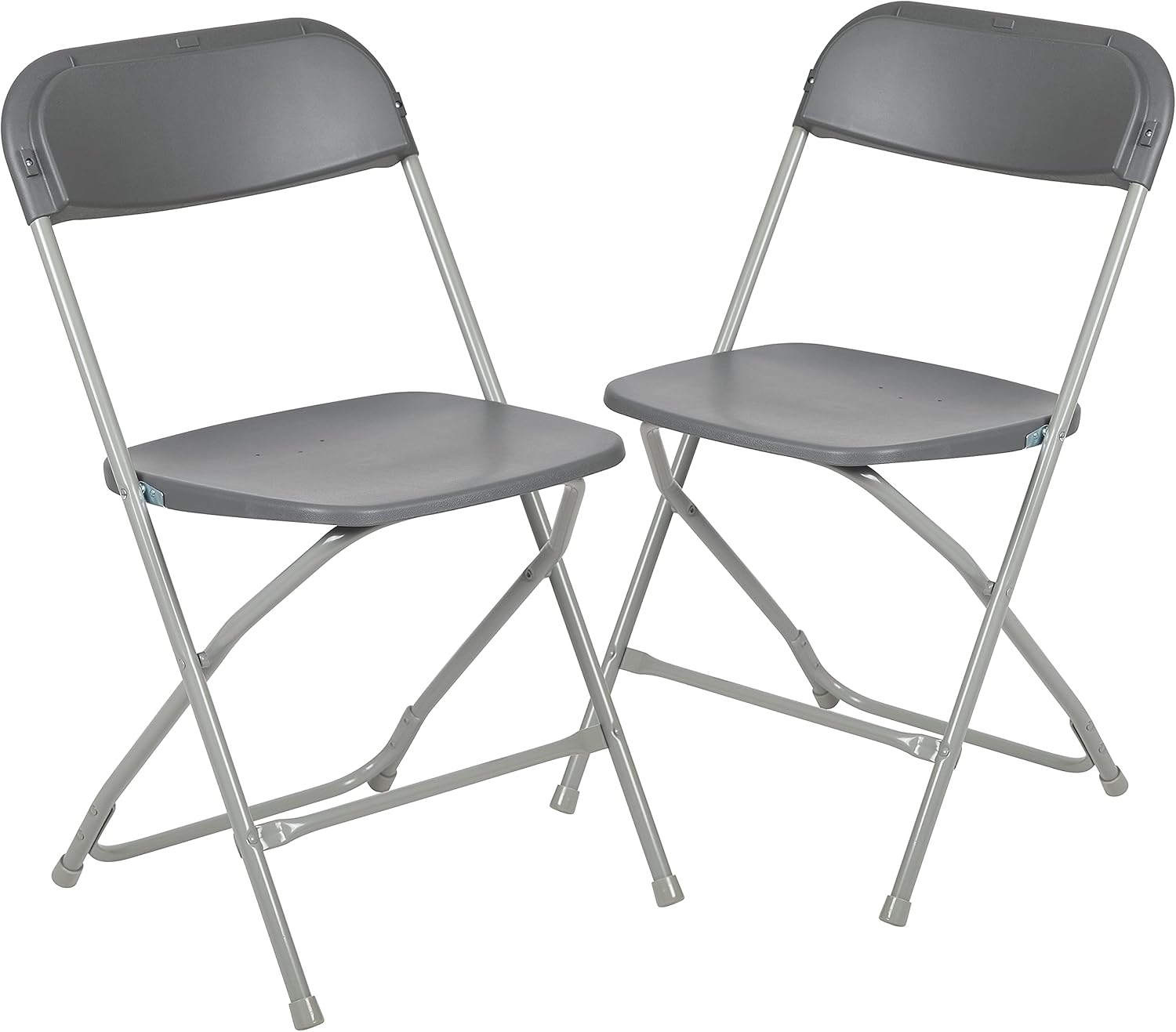 - Set of 2 gray plastic folding chairs with gray metal frame