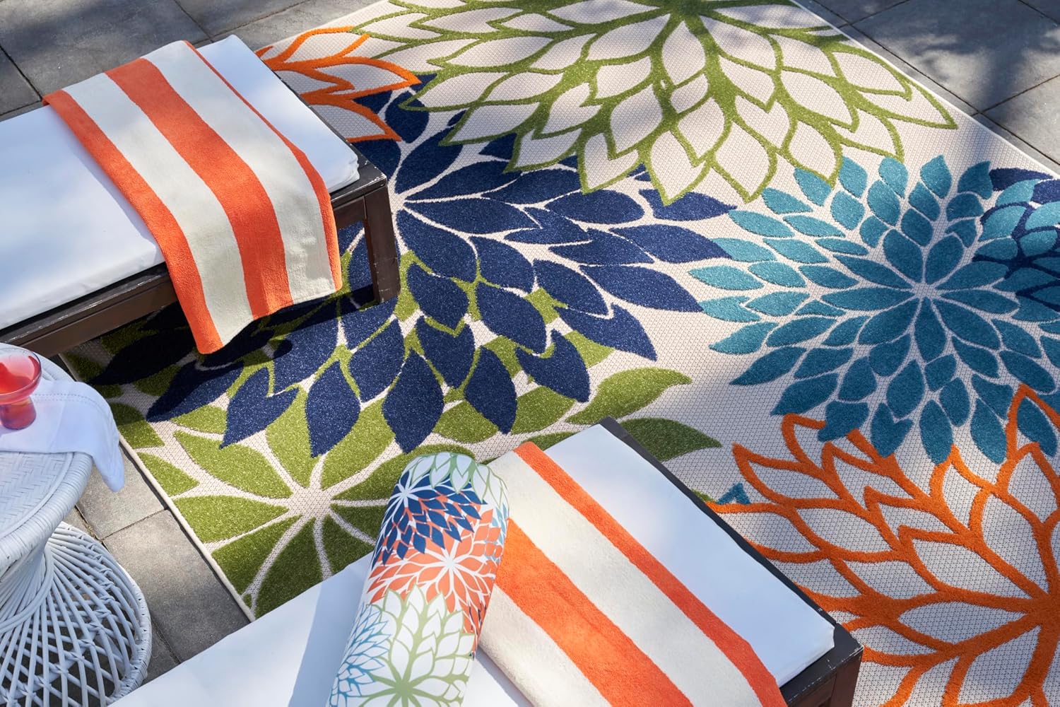 - Floral indoor/outdoor rug brings a cool tropical vibe to your home