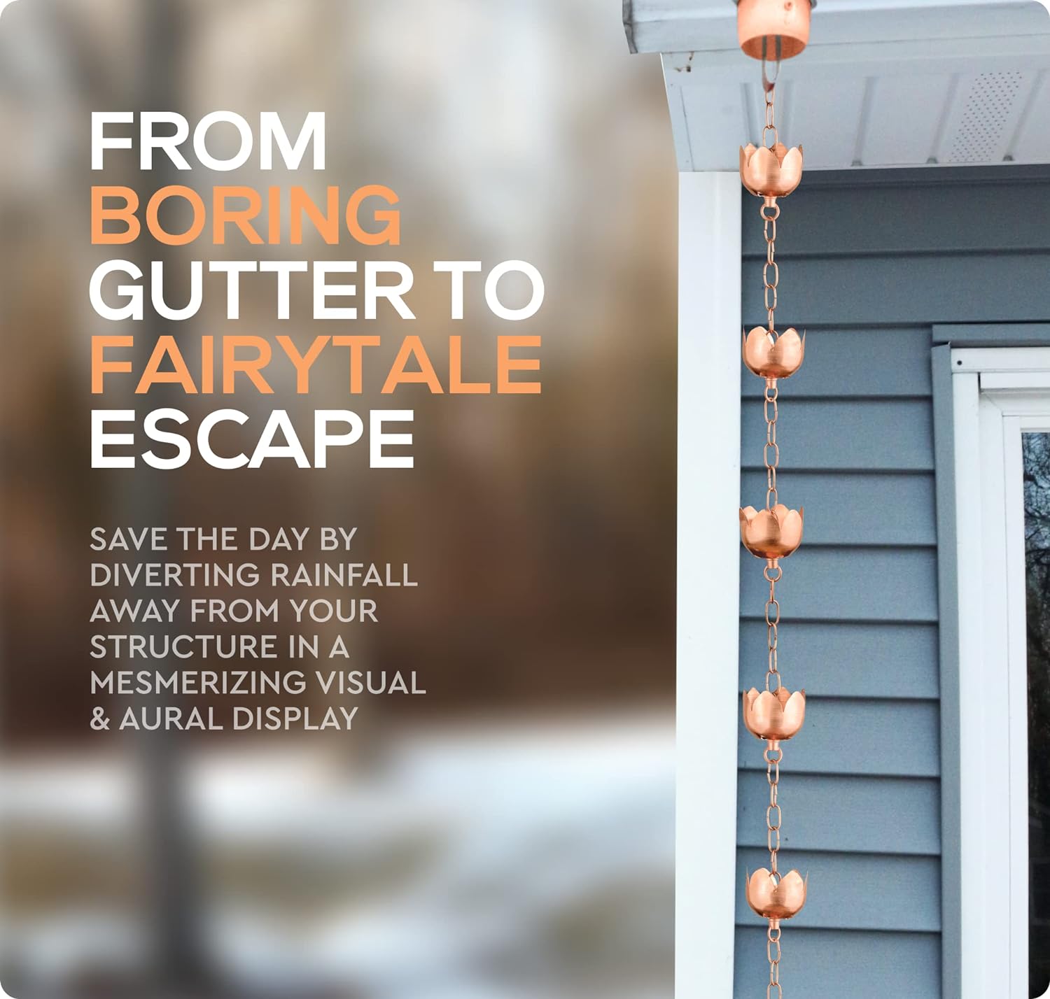 - ENCHANTING GARDEN RAIN CHAINS – Gorgeous Chimes & Cups Make a Beautiful Alternative to Ugly Downspouts – Hang From the Gutter & Watch the Water Collect & Direct Away from Your House in a Lovely Cascading Waterfall Display