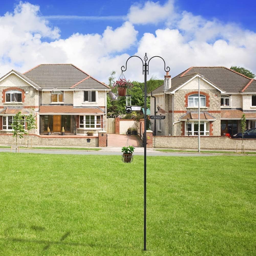 - Premium Quality Bird Feeder Pole: Rust resistant, sturdy bird feeder pole stands 91.33 inches tall and 21.25 inches wide. Easily adjust components to any desired location of bird feeder pole by loosening and tightening wing nuts by hand. No tools required! Forked base prong adds stability and permits easy placement. Just step down to plant. Mesh tray and water bowl detach for easy cleaning