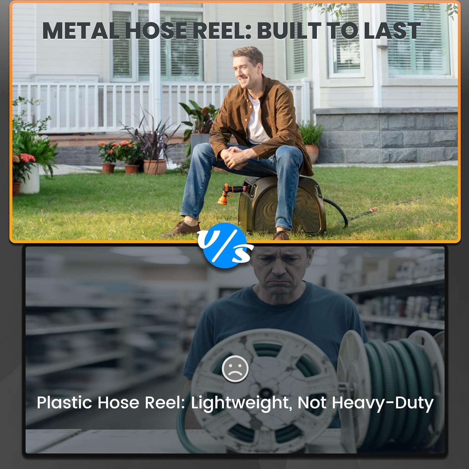 - LARGE CAPACITY - The hose holder comes with a 5 ft leader hose, which can store up to 150 ft of 5/8" garden hose or 200 ft of 1/2" garden hose. But not with the 3/4 inch hose.