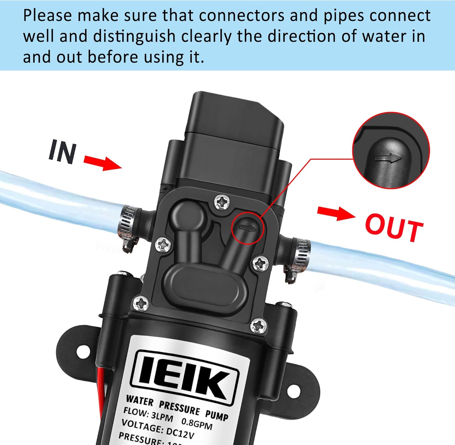 - Application: Before formal use, please connect the water inlet to the pressurized water supply pipe, and after a few minutes of power on trial operation, move it to the working environment. Please use DC12V 2.5A-4A power supply. IEIK fresh water pressure diaphragm pump can be used for automatic pump, ocean, ship, camper, RV, agricultural spray (weak acid and weak base) and truck.