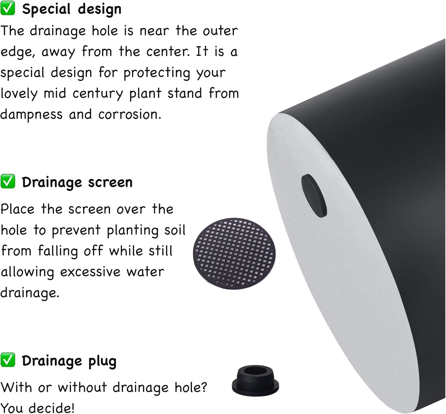 - DRAINAGE PLUG & SPECIAL DESIGN - This flower pot has a drainage hole in bottom to prevent over watering for the plants, comes with drainage plug. With or without drainage hole? You decide! The drainage hole is near the outer edge, away from the center. It is a special design for protecting your lovely mid century plant stand from dampness and corrosion.