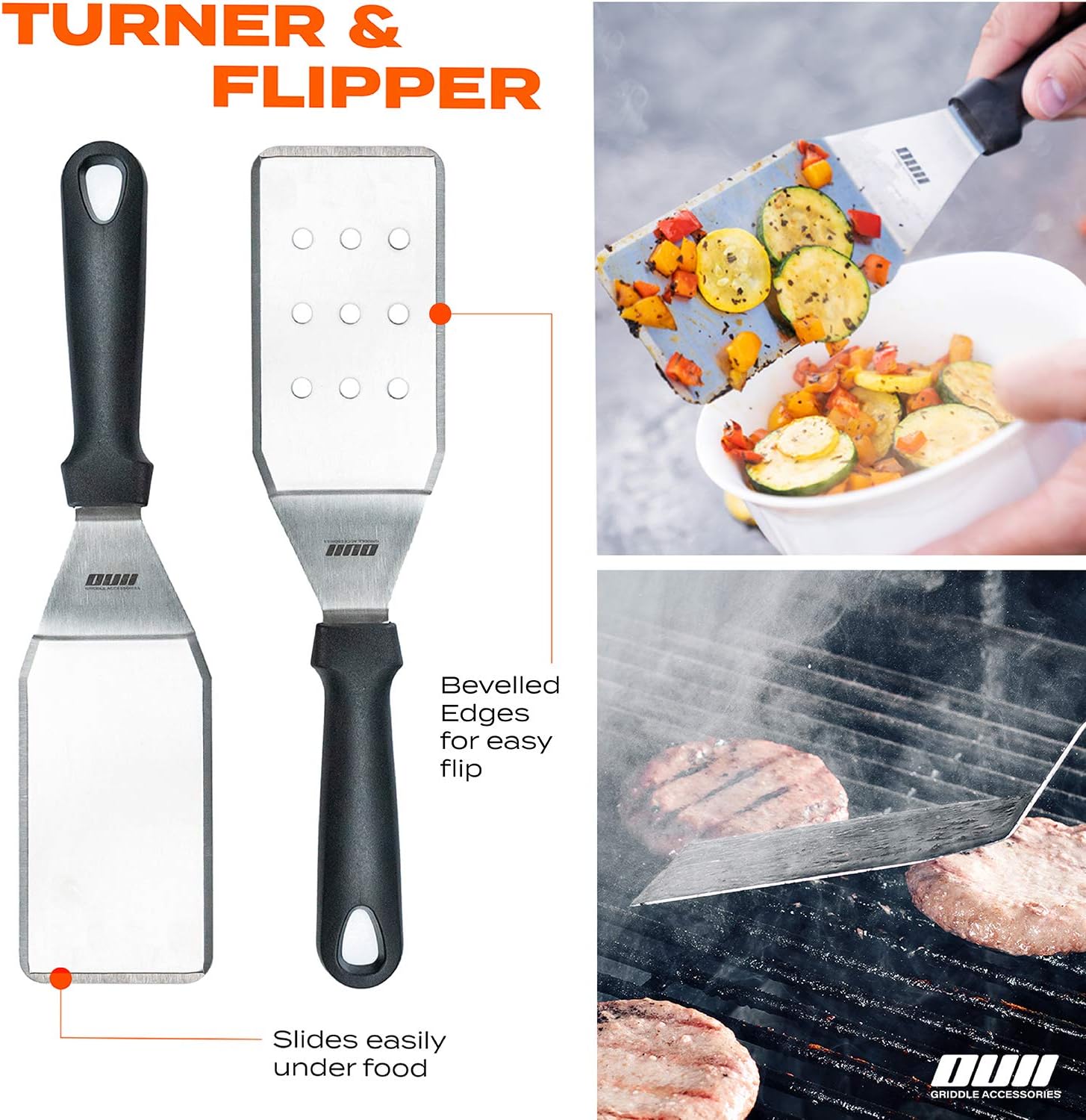 - ⭐ Pack It Away! All your tools are Dishwasher Safe! Once clean, store them away in your Griddle Accessories Case. With a double carry handle and wide opening, it fits everything! – griddle spatulas, slotted spatulas, metal chopper, scraper n scrubber, and squeeze bottle duo. So why not try out The OUII Flat Griddle Set now… because delicious food starts and ends, right here!