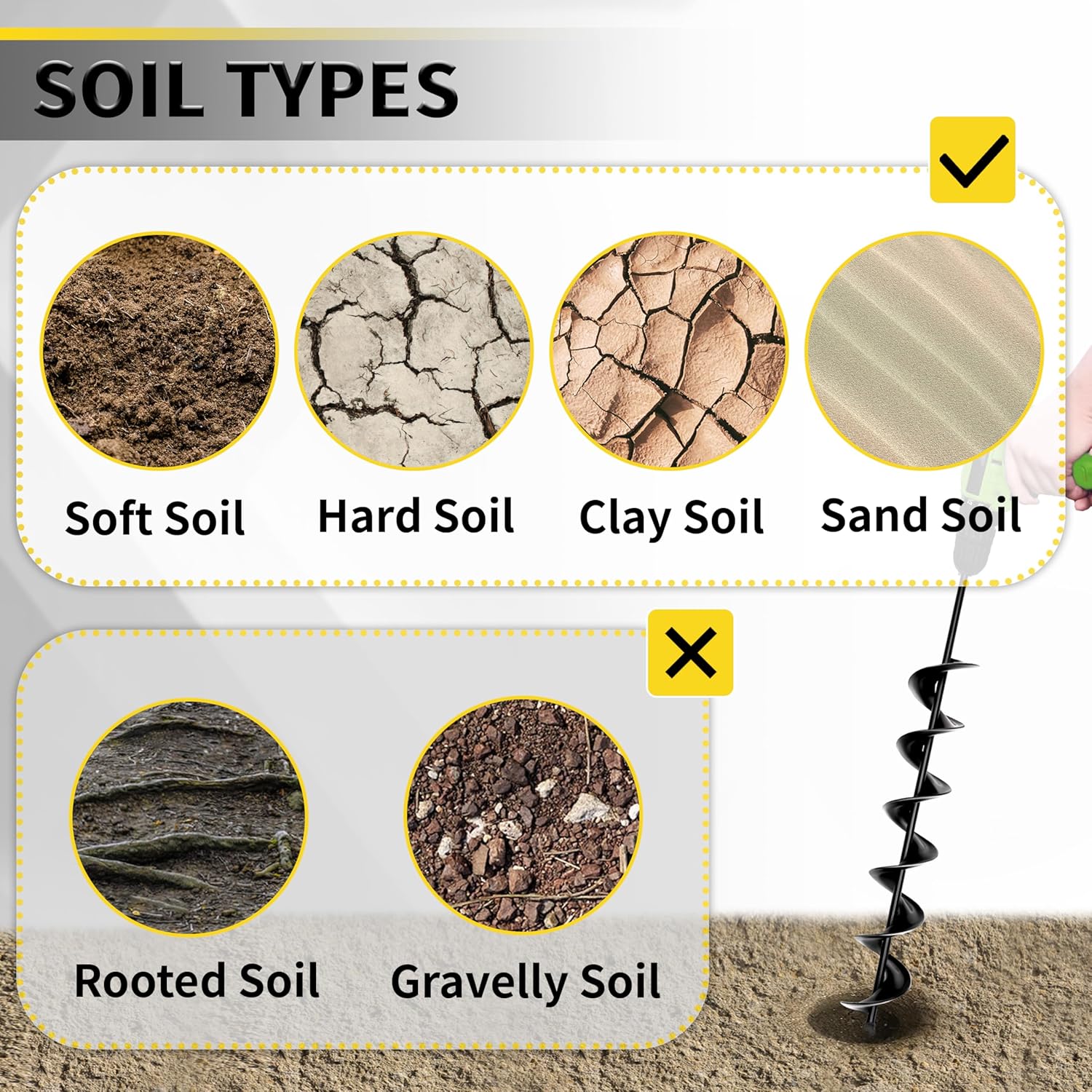 - 【Easily Use】Just insert the planting auger into the drill chuck, tighten and lock it, then hold with both hands, start digging. Reserve the drill transport the soil to edge, you will get the perfect holes you wanted. Suggest using 18V or greater cordless drill with adjustable drill chuck.
