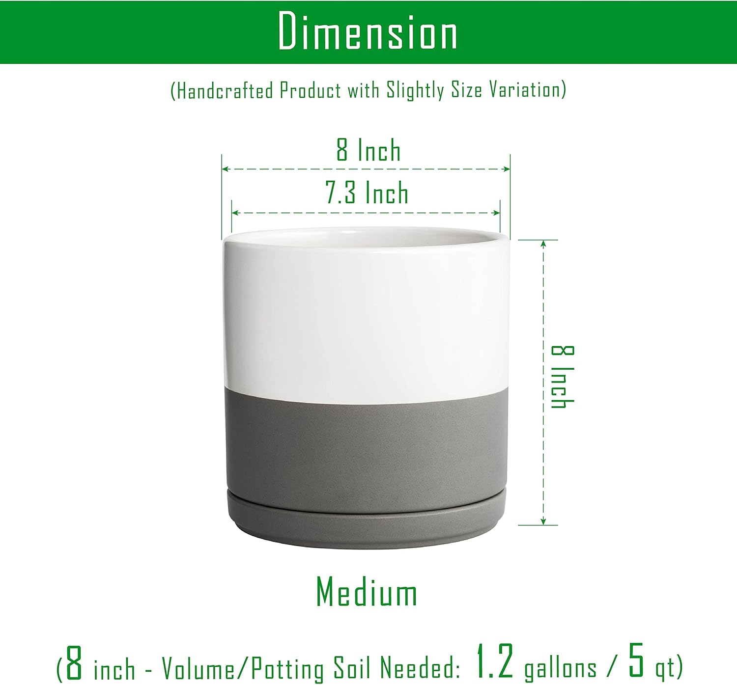 - Pack of 2 Planter Pots: 8" Diameter (7.3" Inner Diameter) * 8" Height. Potting Soil Needed: 1.2 gallons / 5 qt.