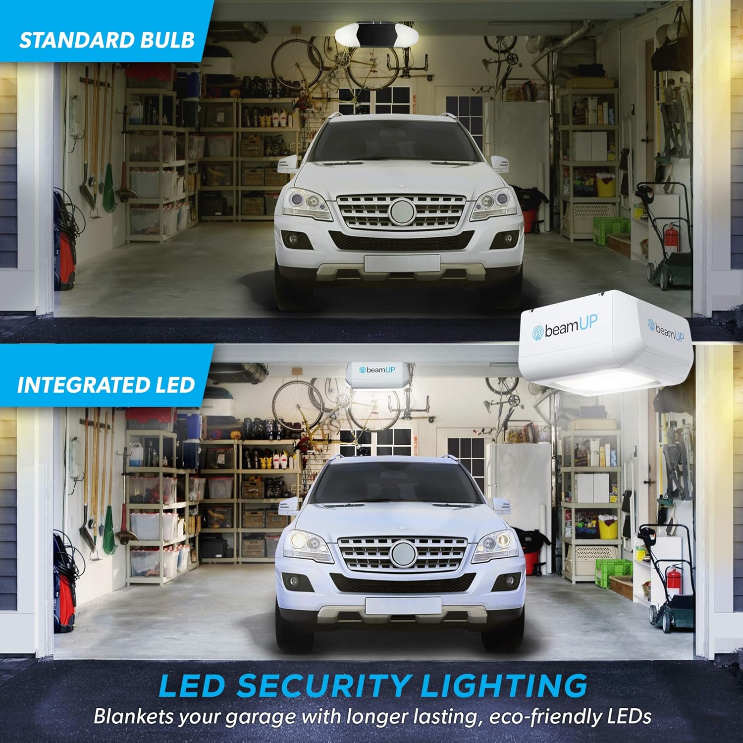 - ADVANCED SAFETY AND SECURITY: This wireless garage door opener has 1500-lumen energy-efficient LED security lighting – never replace a lightbulb! Additionally, the photo eye safety system provides an additional level of safety to help protect your family