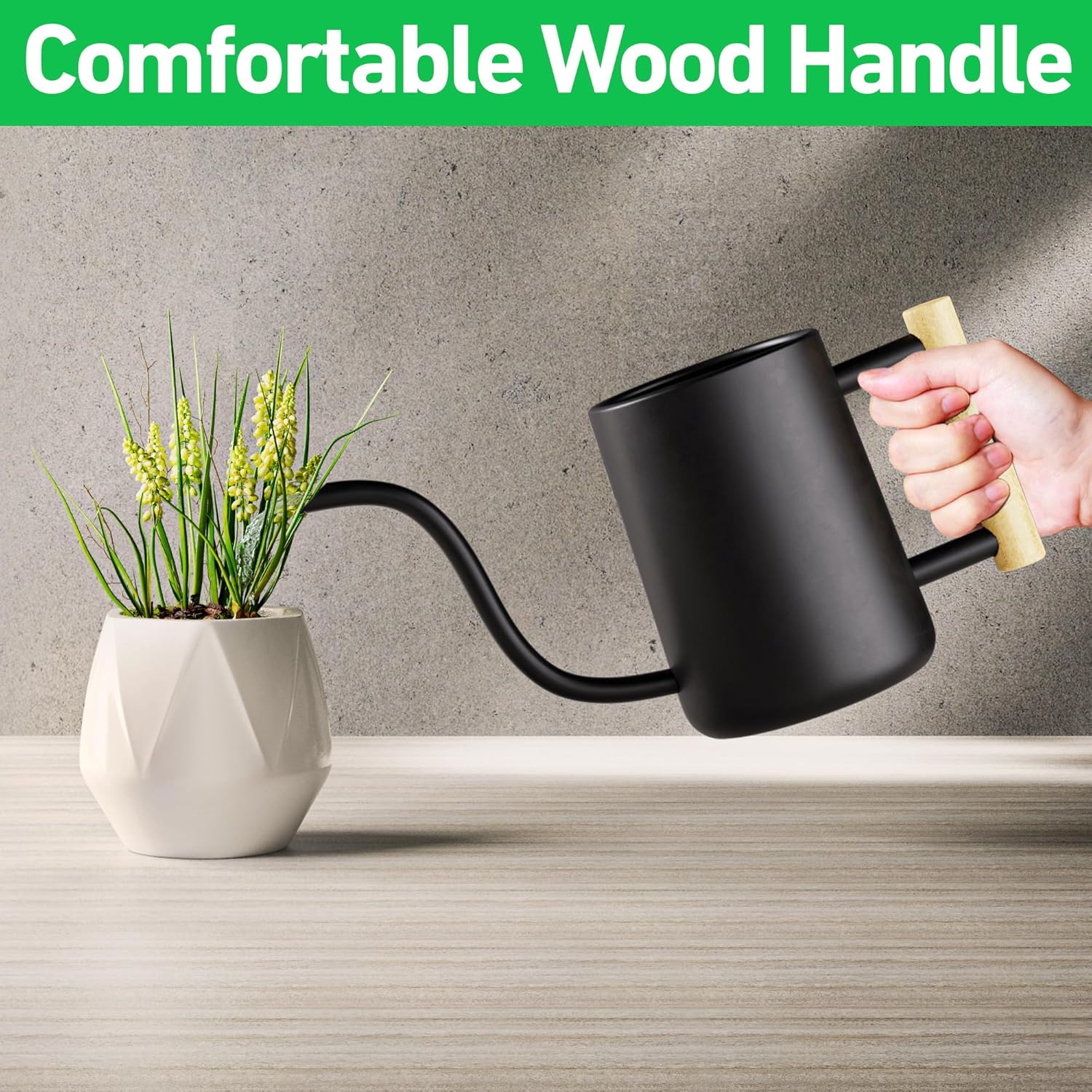 - COMFORTABLE WOODEN HANDLE - Unlike other watering cans for indoor plants which use thin, hard to hold metal handles, this gooseneck watering can has a thick, natural wood handle that is easy to hold and won't slip out of your grip. Make watering your houseplants easy and enjoyable!