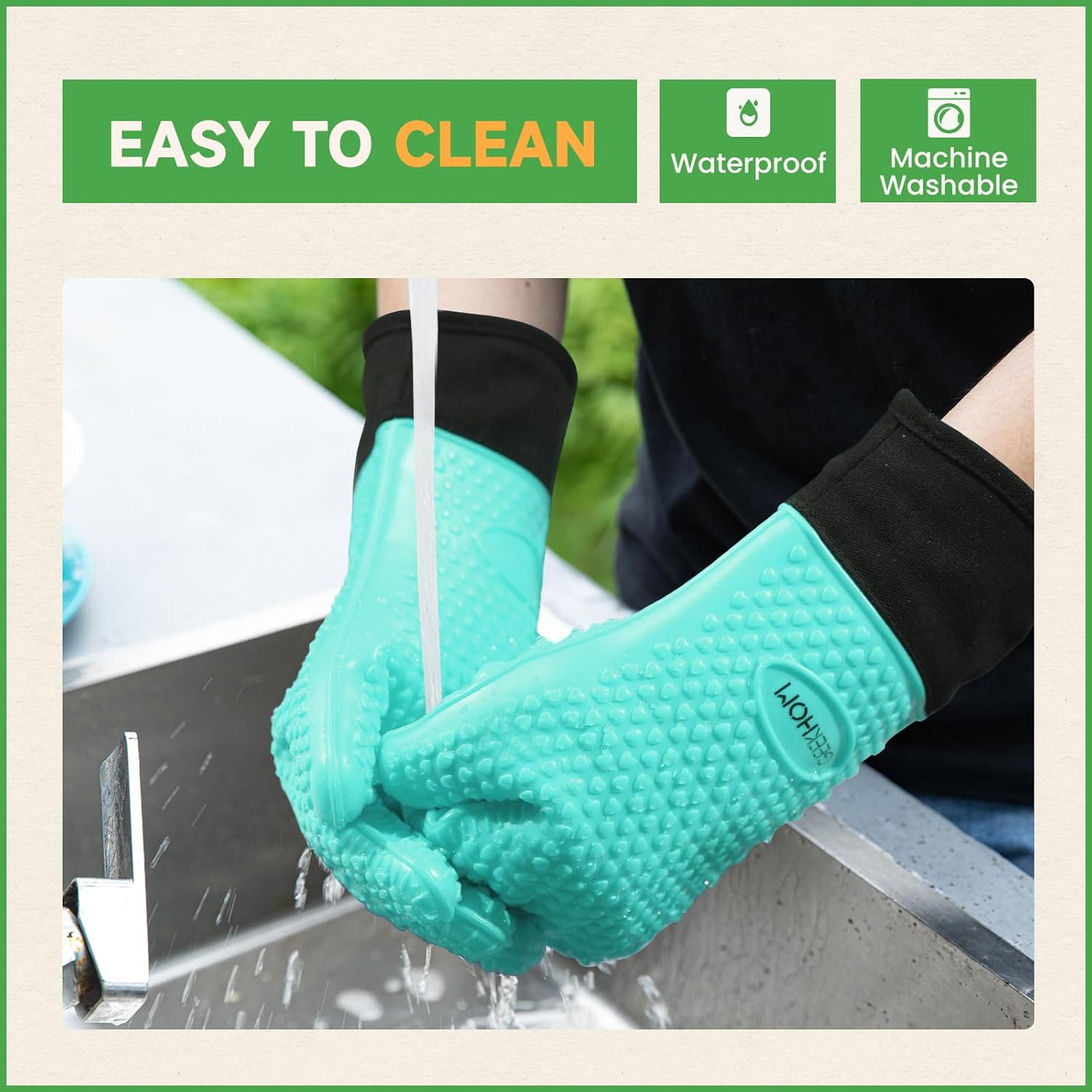- Unrivaled Heat Defense for Ultimate Safety: Engineered with heat-resistant silicone up to 446°F, our oven mitts protect hands from scorching grill surfaces, boiling pots, and oven racks while maintaining flexibility to flip burgers or adjust smoker vents effortlessly; The 13.7" extended length with 3.17” sleeve shields wrists during outdoor barbecue adventures