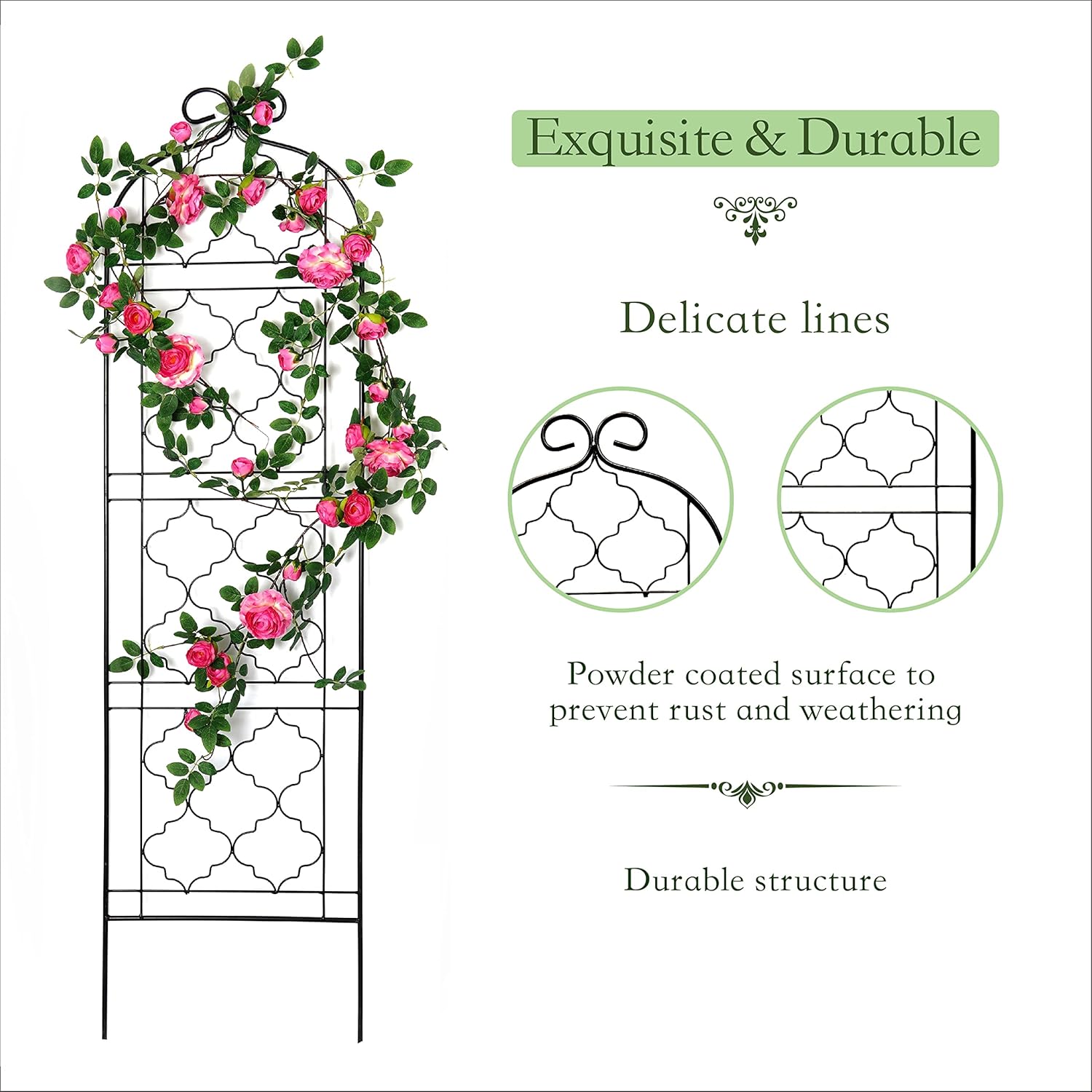- [Sturdy Stability Structure]: With heavy duty iron frame and powder coated welded material. 7.7 inch ground spike inserts into the ground and add stability to the trellises.