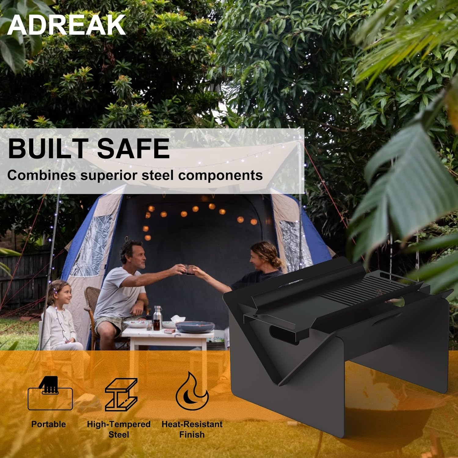 - Ideal Portable Steel Fire Pit: Keeping you fire off the ground and contained means you’re able to use the Adreak fire pit at those campsites that don’t allow fires on the ground and the tough 3mm thick steel means you know it’ll last.
