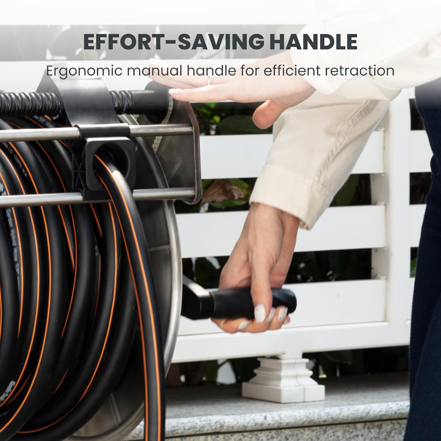 - EASY WINDING - Make garden hose storage simple and clean! The easily assembled crank handle and the hose guide with garden hose reel help you manually wind the hose evenly around the reel with less mess.