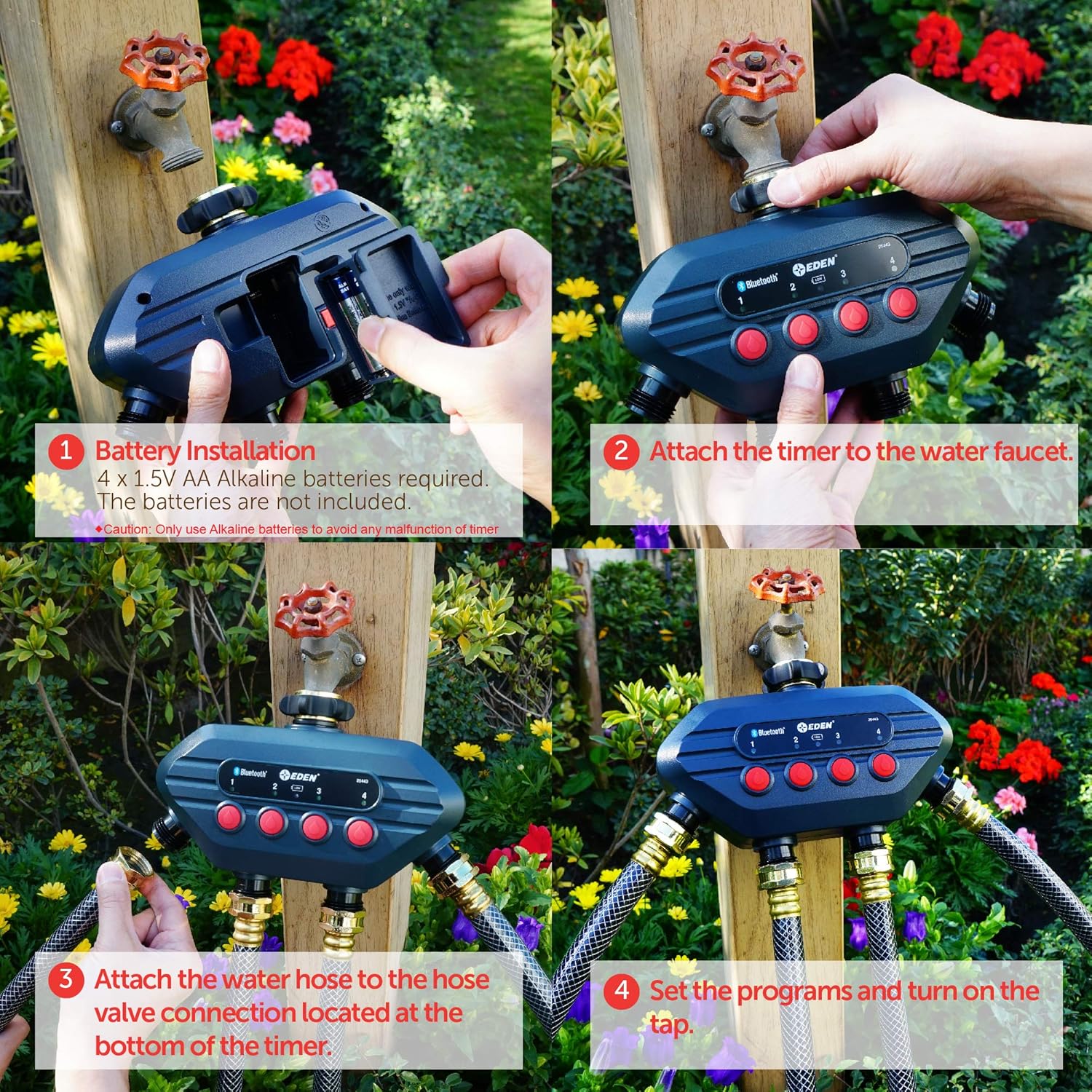 - Our 4-zone independent programming allows you to personalize your watering needs.