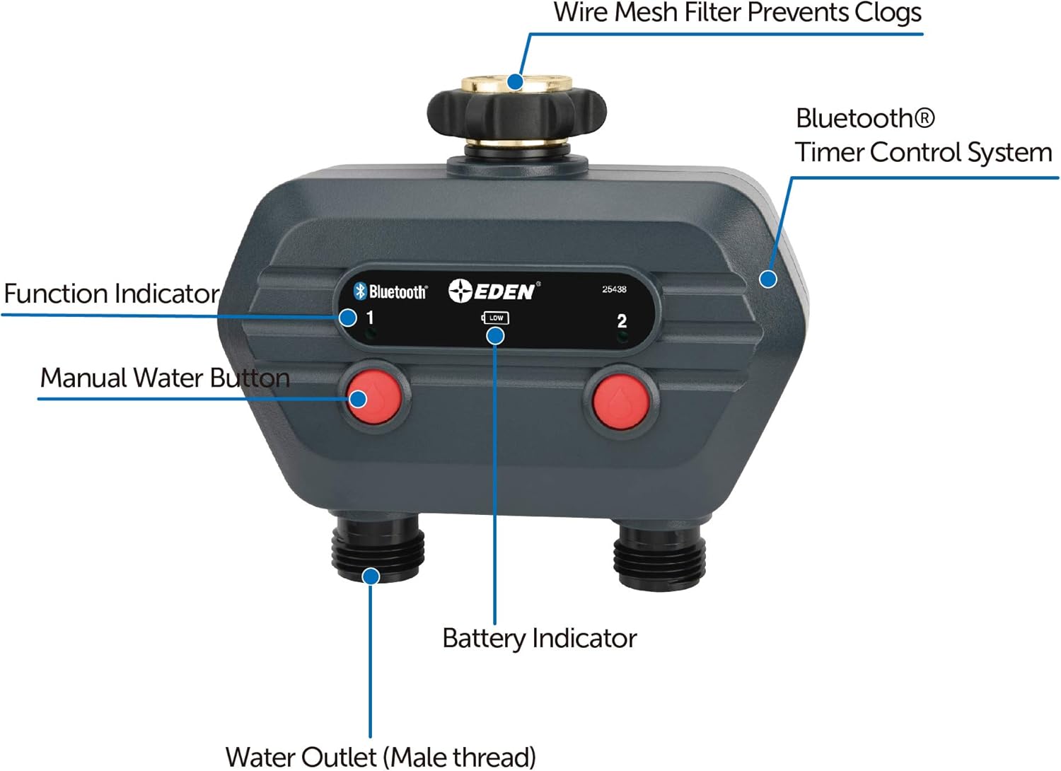 Eden 93442 2-Zone Bluetooth Water Timer for Smart Irrigation - Remote Control via App, Customizable Scheduling, and Water Delay Setting