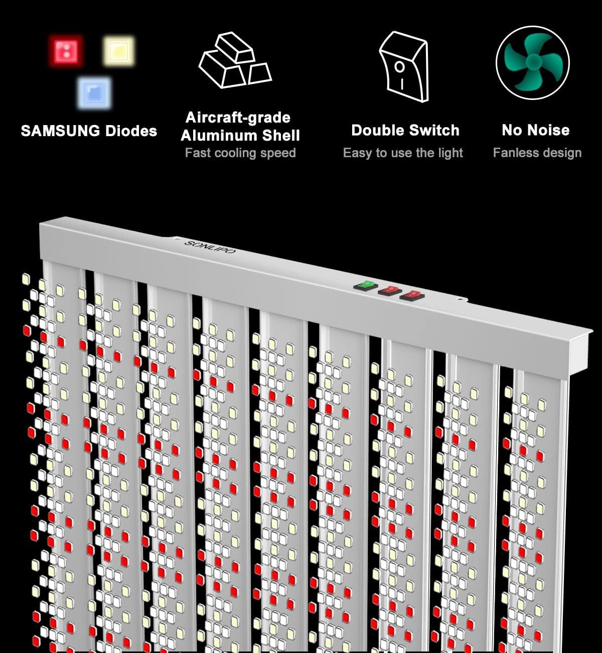 - VEG & Double BLOOM Switch : Aaccording to the growth and yield of plants, SONLIPO designed 3 switches, VEG, BLOOM and enhance BLOOM, to facilitate the control of red and blue light spectrum, to make the roots and stalks of plants grow thicker, and prevent them from growing taller in vain. Enhance RED light, can greatly increases the size and number of flowers to maximize the yield of the plant, maximum 2.9 g/w.