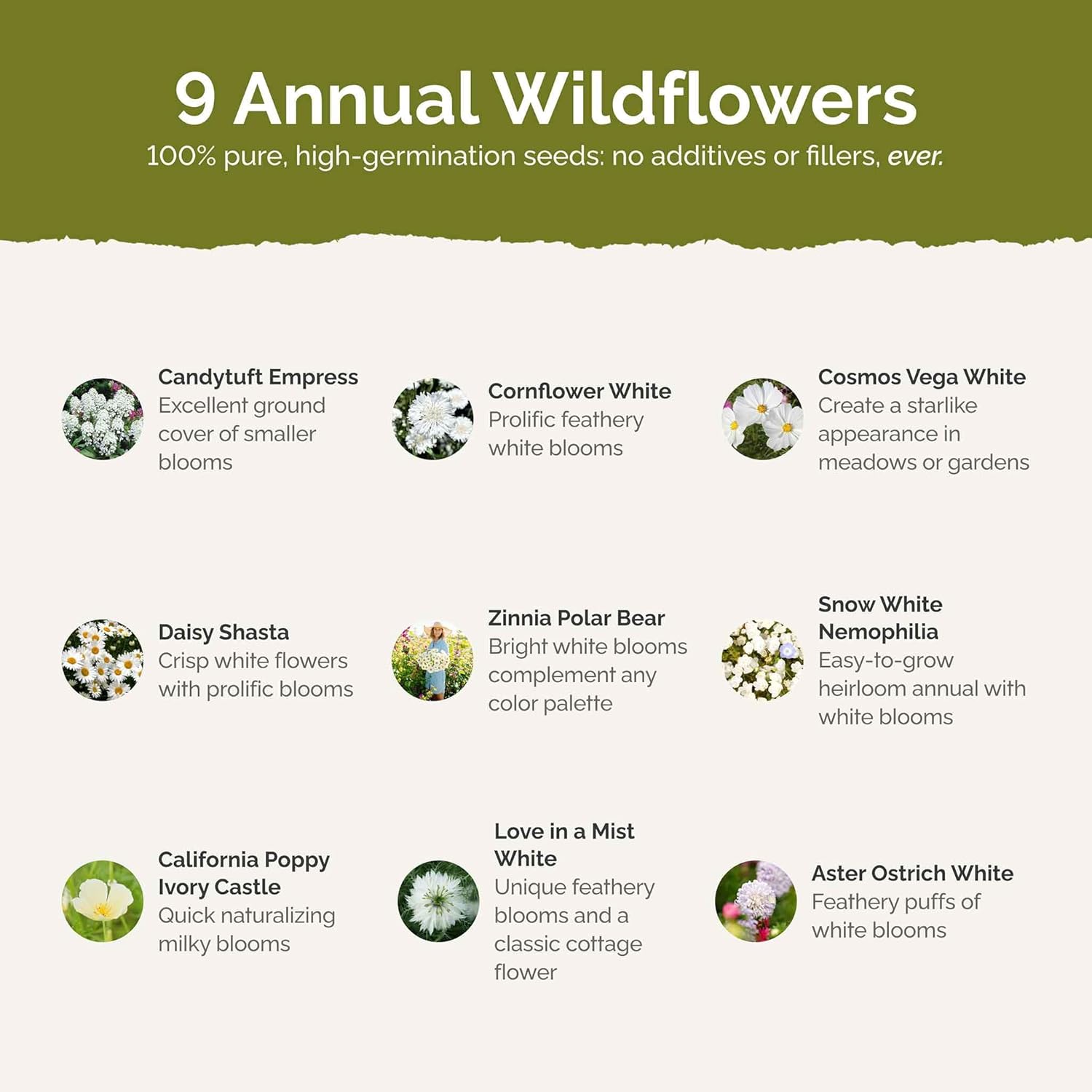 - 100% Pure, Non-GMO Seeds - No fillers, favorites only! Includes 9 easy-to-grow species: White Candytuft, Cornflower White, Cosmos Purity, Shasta Daisy, Zinnia Polar Bear, Snow White Nemophilia, Love in a Mist White, White Duchess Aster
