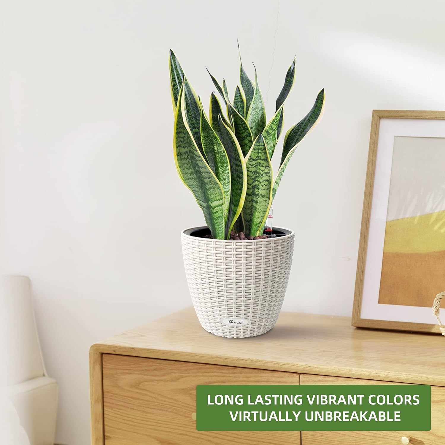 Dexceder 9x8 Inches Rattan Self Watering Planter Indoor Outdoor, Inner Pot Design, Thickened Table Flower Plant Pot with Water Level Indicator (Ivory White)