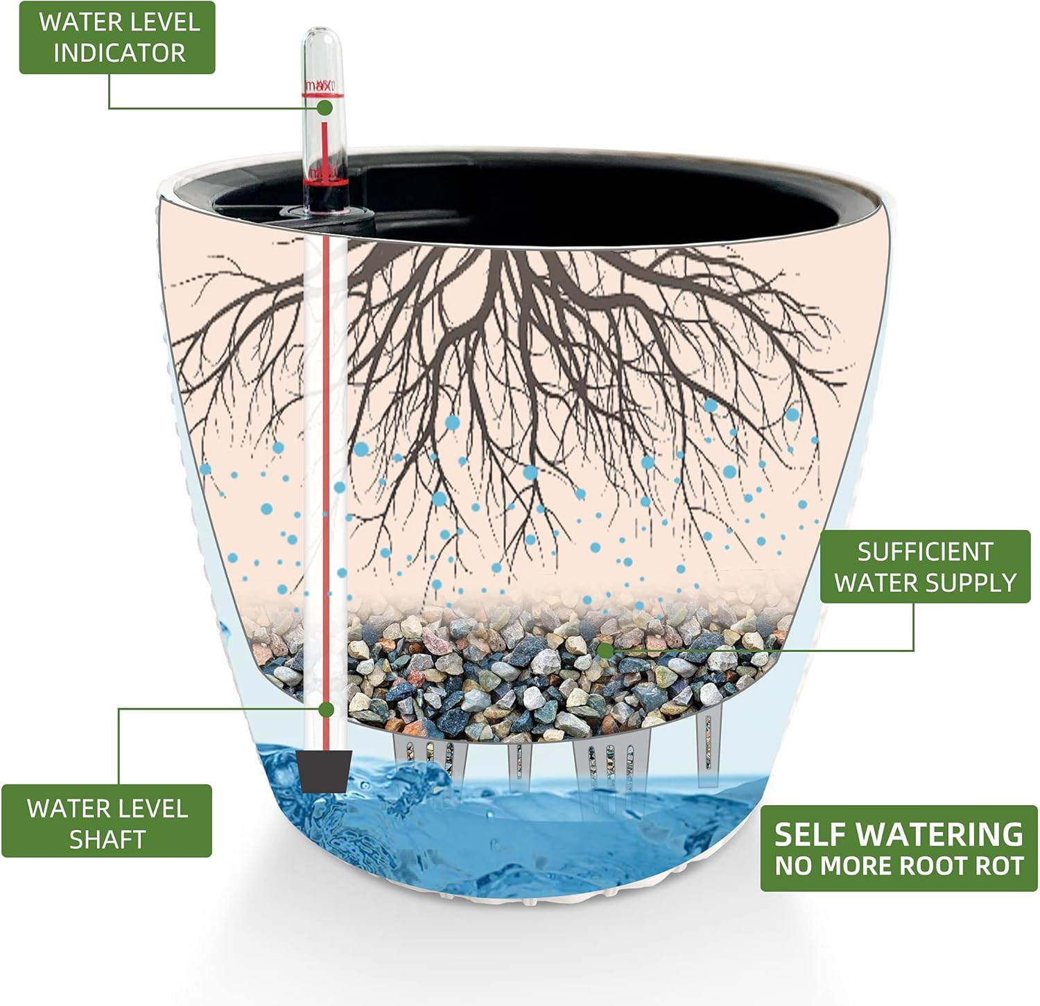 - Self Watering System: The integrated water reservoir keeps soil moist and automatic, with an indicator to show when to water again.