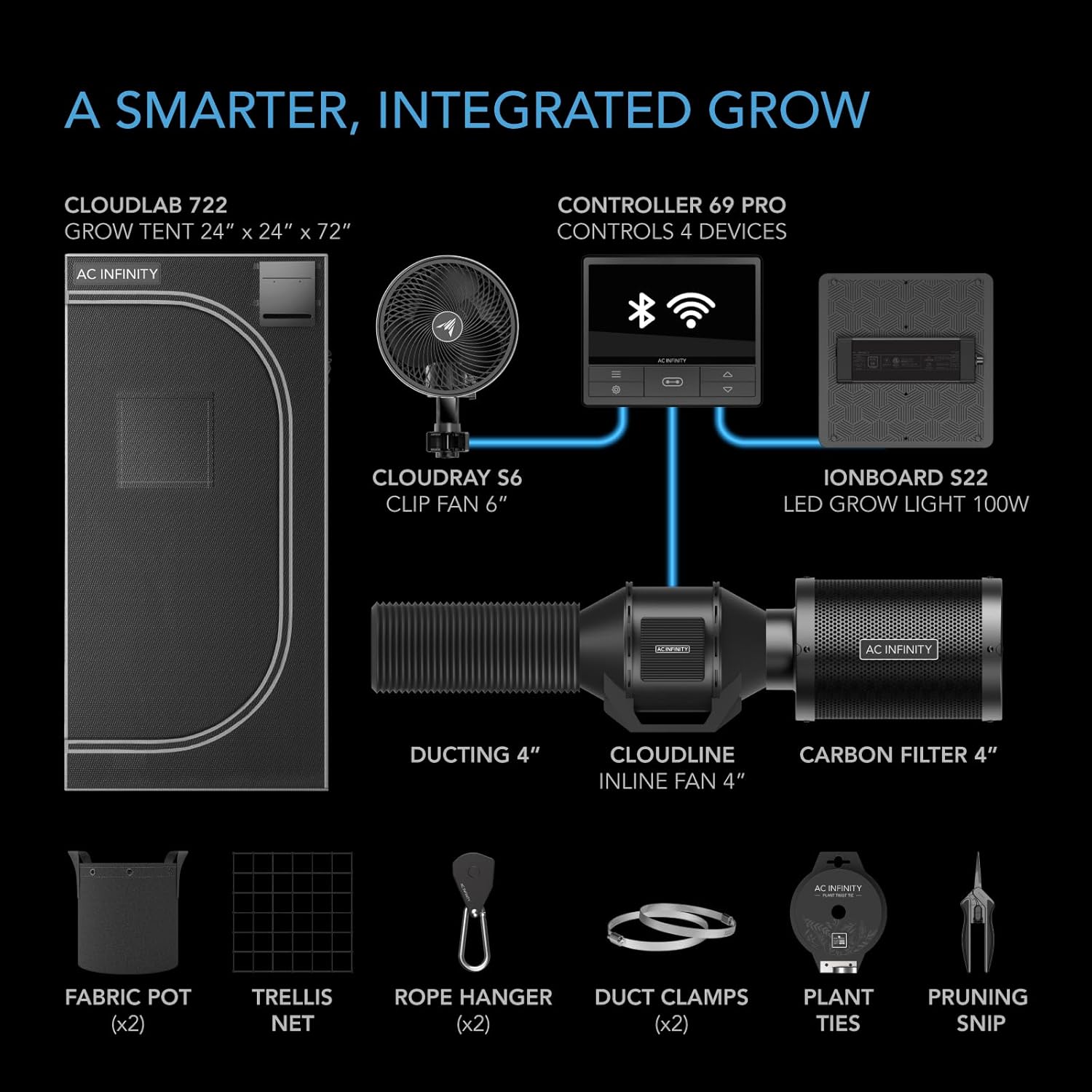 - An advance grow tent kit with smart controls and integrated components to start an indoor growing system.