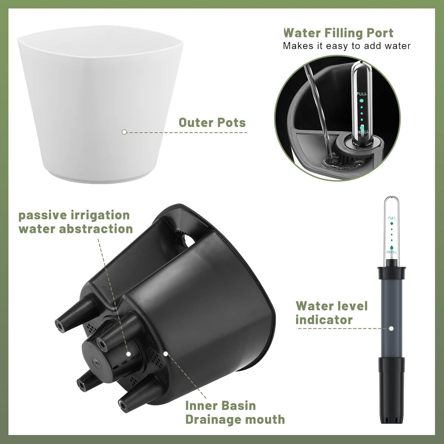 - Many self-watering pots do not have any drainage system, which can quickly lead to root rot. GS Garden's pot set has a unique support design that separates the plant's roots from the water storage layer, and promotes root growth and development through the micro-pores at the bottom of the inner, thereby creating root oxygen circulation.
