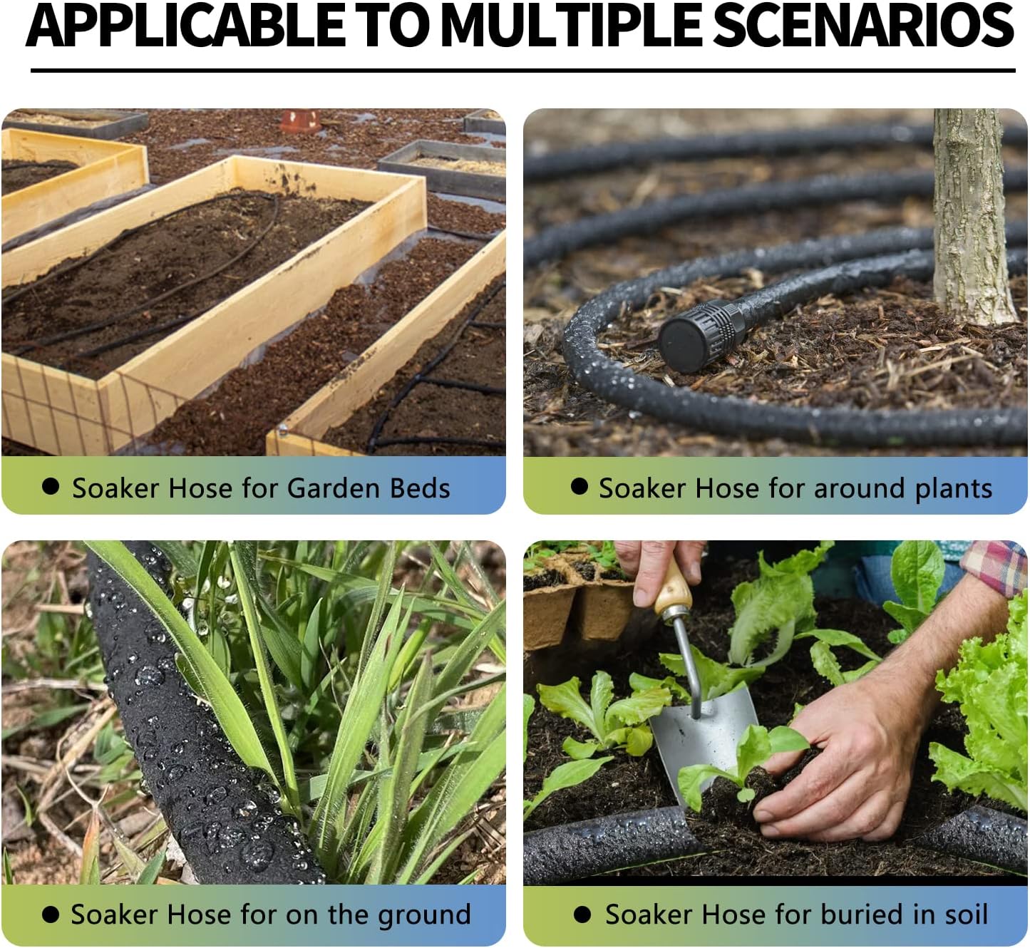- DIY Your Garden Watering System – The short soaker hose could be used for a tree or small garden beds for most of house yard. This soaker hose package including 3 pack 15ft soaker hose. And these drip hoses could be connected to be a long soaker hose 45ft. It almost be like a 50ft soaker hose. That will be more flexible as a round soaker hose.