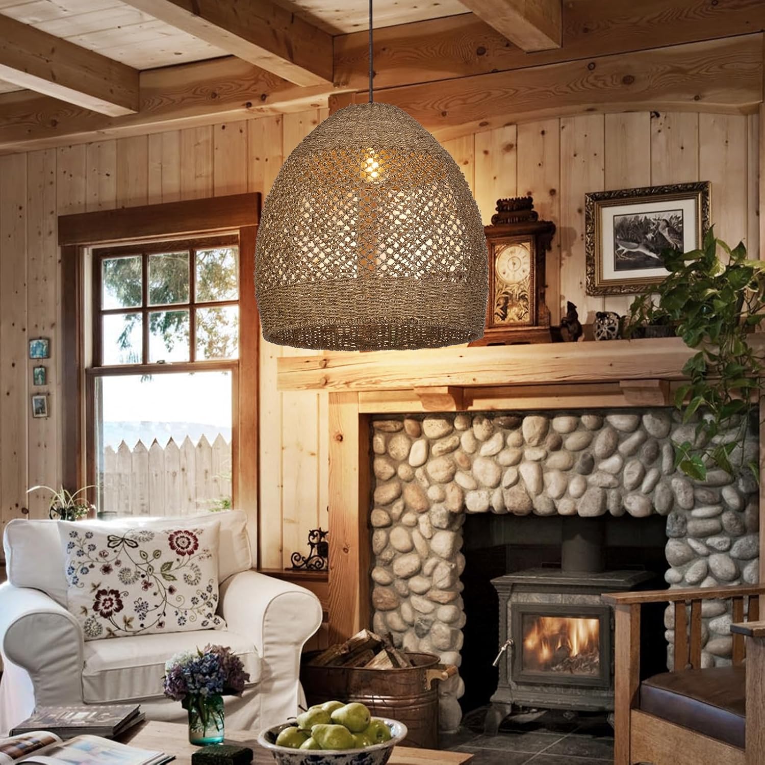 Arturesthome 19.6" Retro Rattan Woven Pendant Light Fixture, Chandelier with Lamp Shade Light Cover, Hanging Lighting for Kitchen Dining Room Foyer
