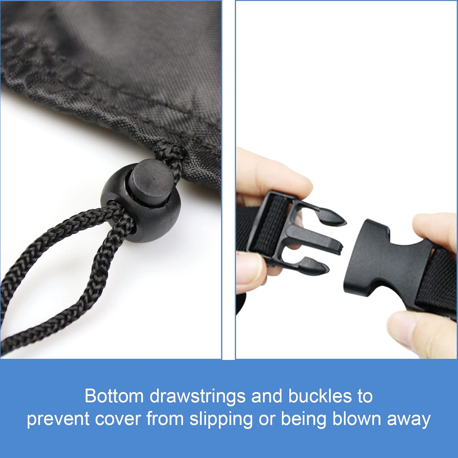 - ADJUSTABLE STRAP: The adjustble straps with buckles and drawing string at the bottom can flexibly adjust the tightness of the cover so that it can sit and stay firmly over your gas grill cover, preventing it from being blown away by the wind.