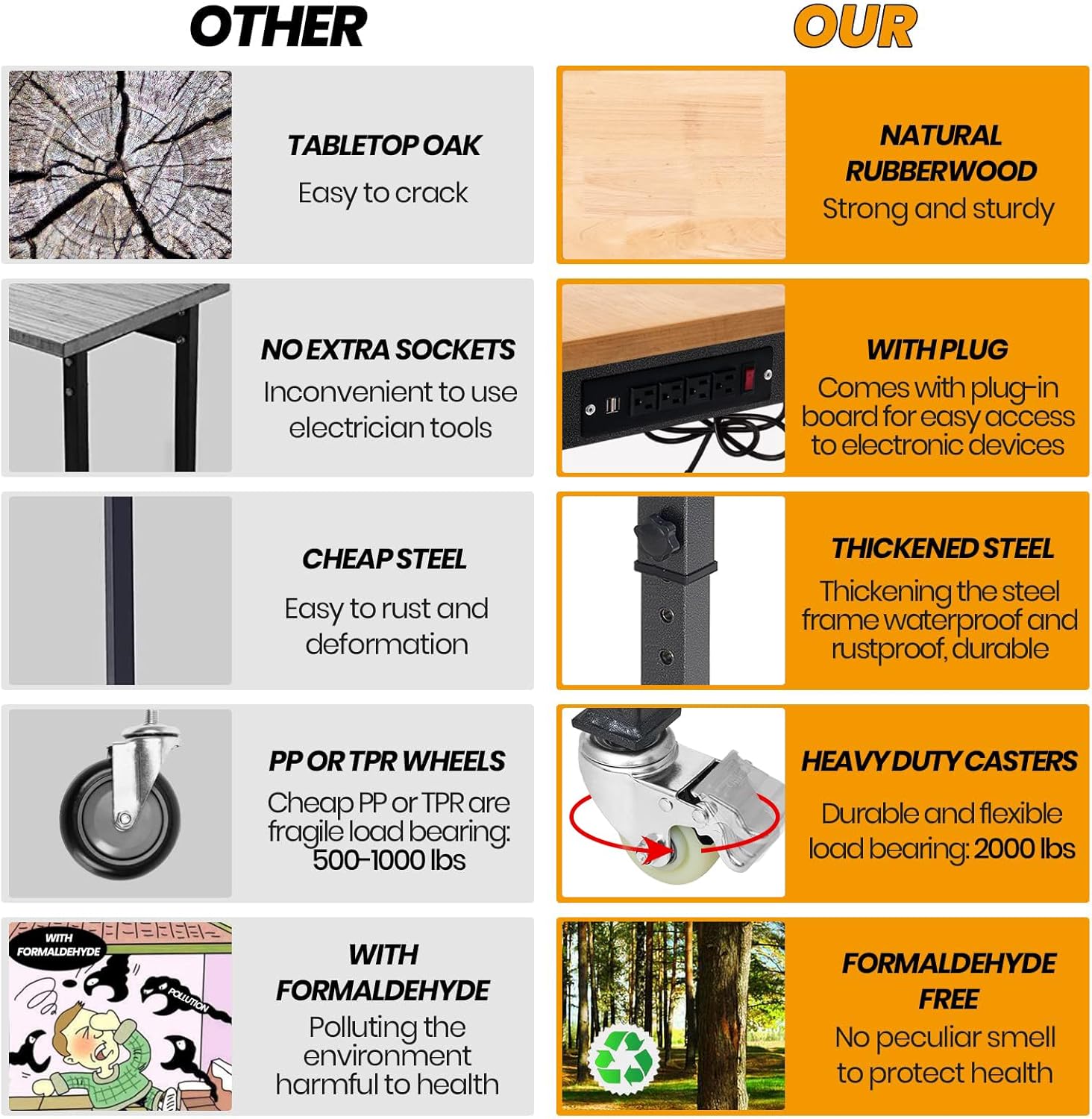 60" Adjustable Work Bench, Rubber Wood Top Workbench Heavy-Duty Work Table with Power Outlet with Wheels, 2000 LBS Load Capacity Hardwood Work Benches for Garage, Workshop, Home, Office, Easy Assembly
