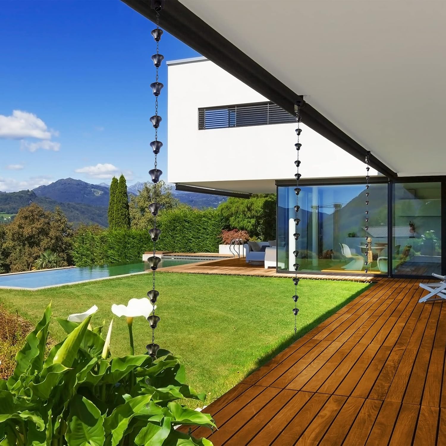 - Rain chain Easy to Hang: It includes an additional 3.9" wide hanger and an anchoring stake to easily remove these rain chains from any tree, window pane or patio, or set them on your drain, or hang them in a place where they can handle large amounts of water.