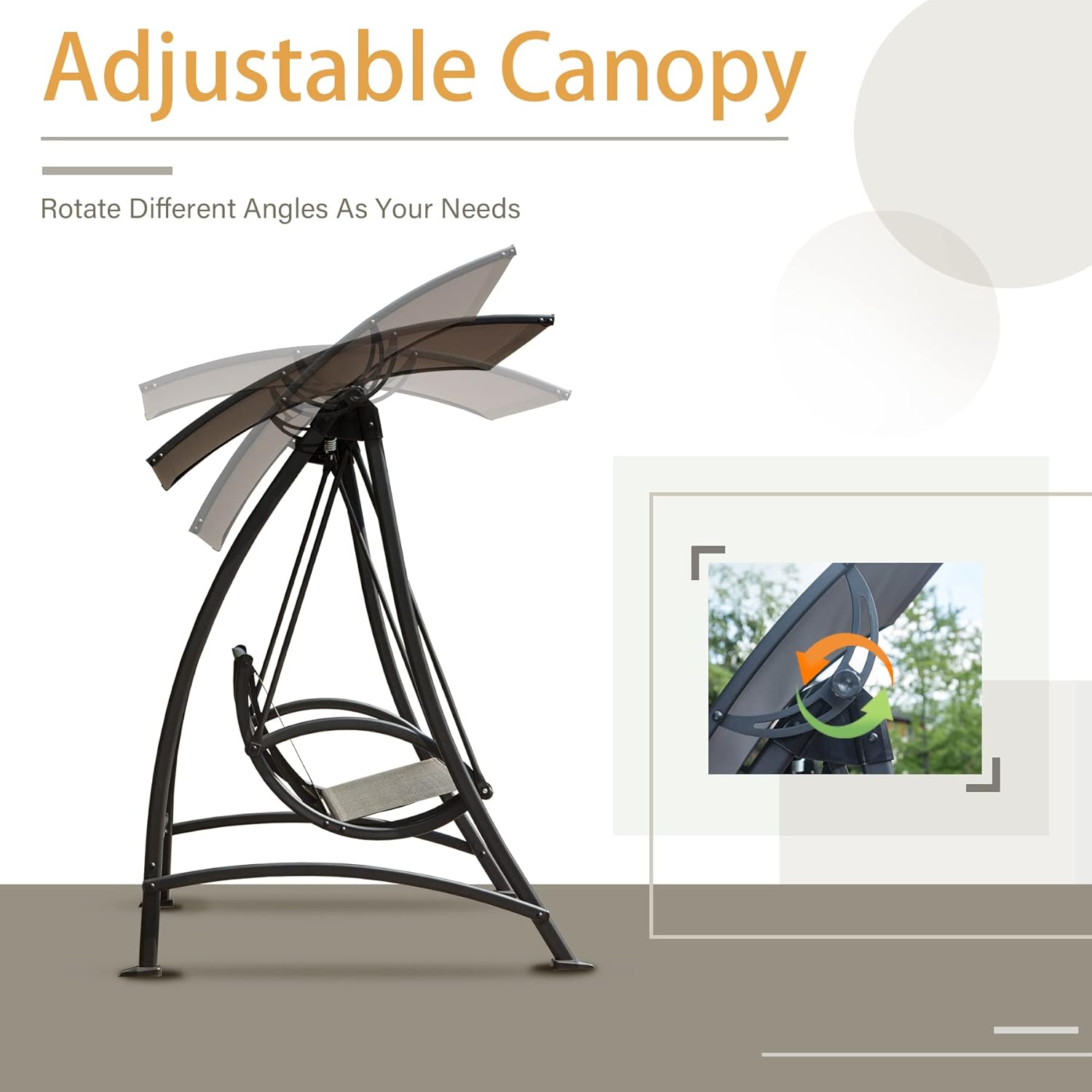Domi Porch Patio Swing with Adjustable Canopy, 3-seat Swing with Stand, Outdoor Swings w/Armrests, Weather Resistant Steel Frame and Textilene Fabric Dark Brown