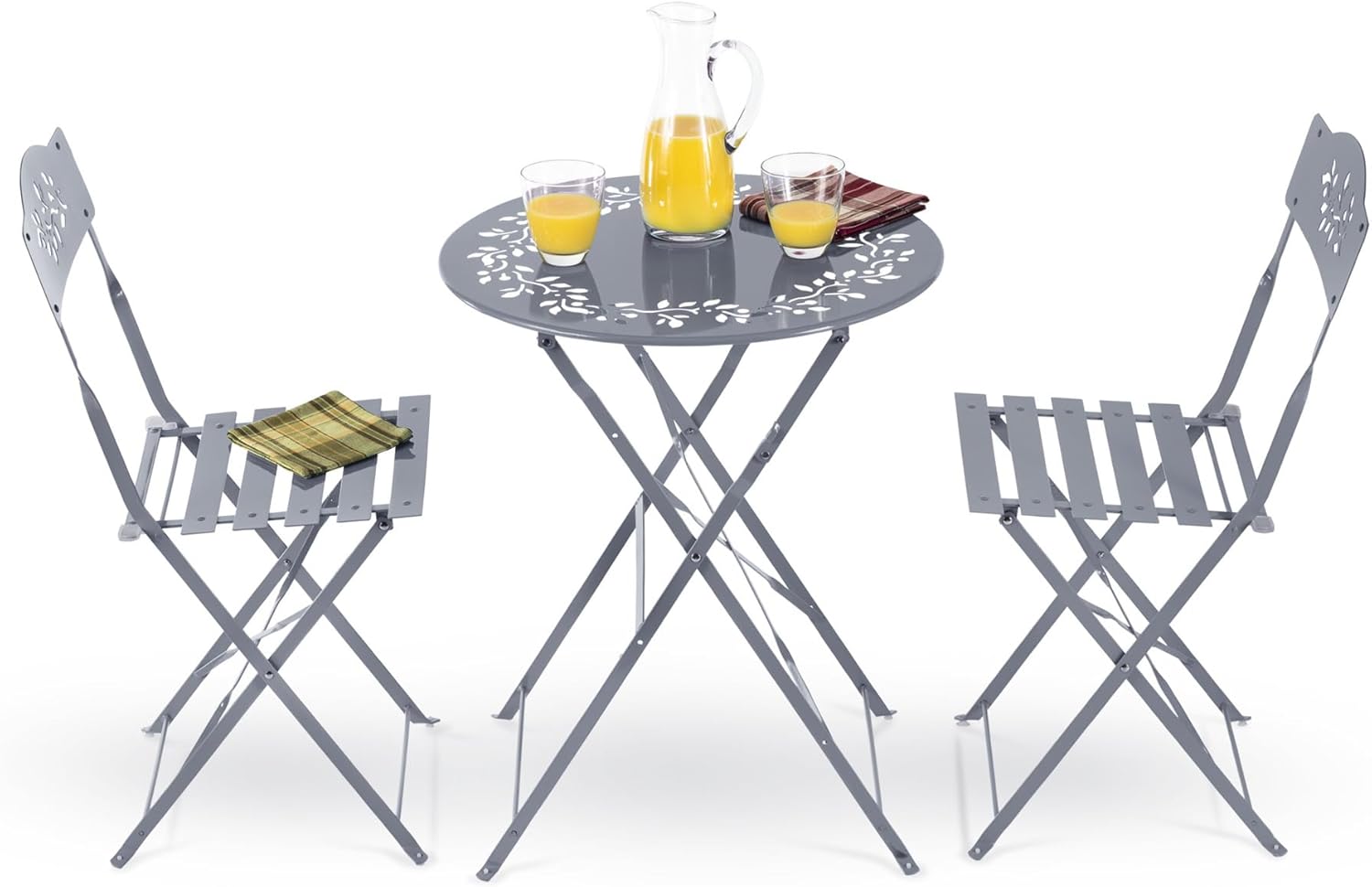 - PATIO SEATING SET: Sophisticated, steel 3 piece bistro set features an intricate laser cut leaf design in a classic neutral shade to complement your indoor or outdoor living space or patio