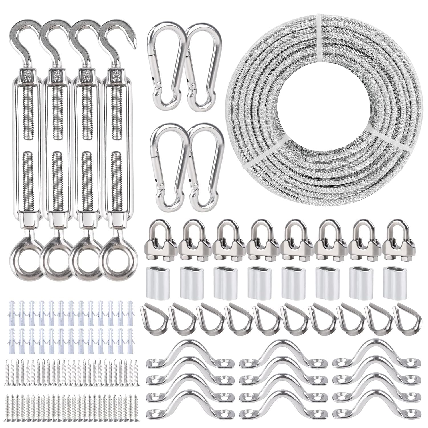 - 3/16" Cable Railing Kit: Package includes a 200 ft steel cable, 4× turnbuckle hook and 4× spring snap hook, 8× cable clip clamp, 8× aluminum sleeve, 10× stainless steel thimble, 12× eye straps, 26× wood screw, 26× expansion pipe, 26× drilling screws