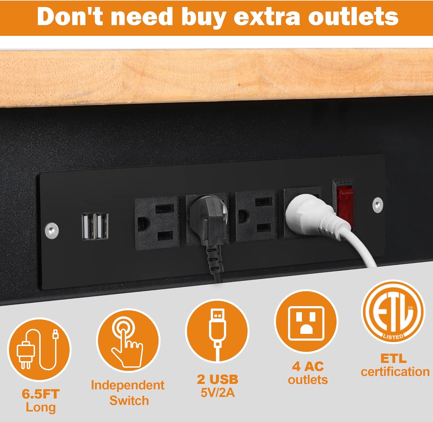 - 4 AC 2 USB Power Outlets: The ETL certified power strip has 4 AC Outlets, 2 USB Ports and 1 Switch, with 6.5 ft long Wire, which is safe and durable, making it easy to equip the worktable with various electric tools and lights