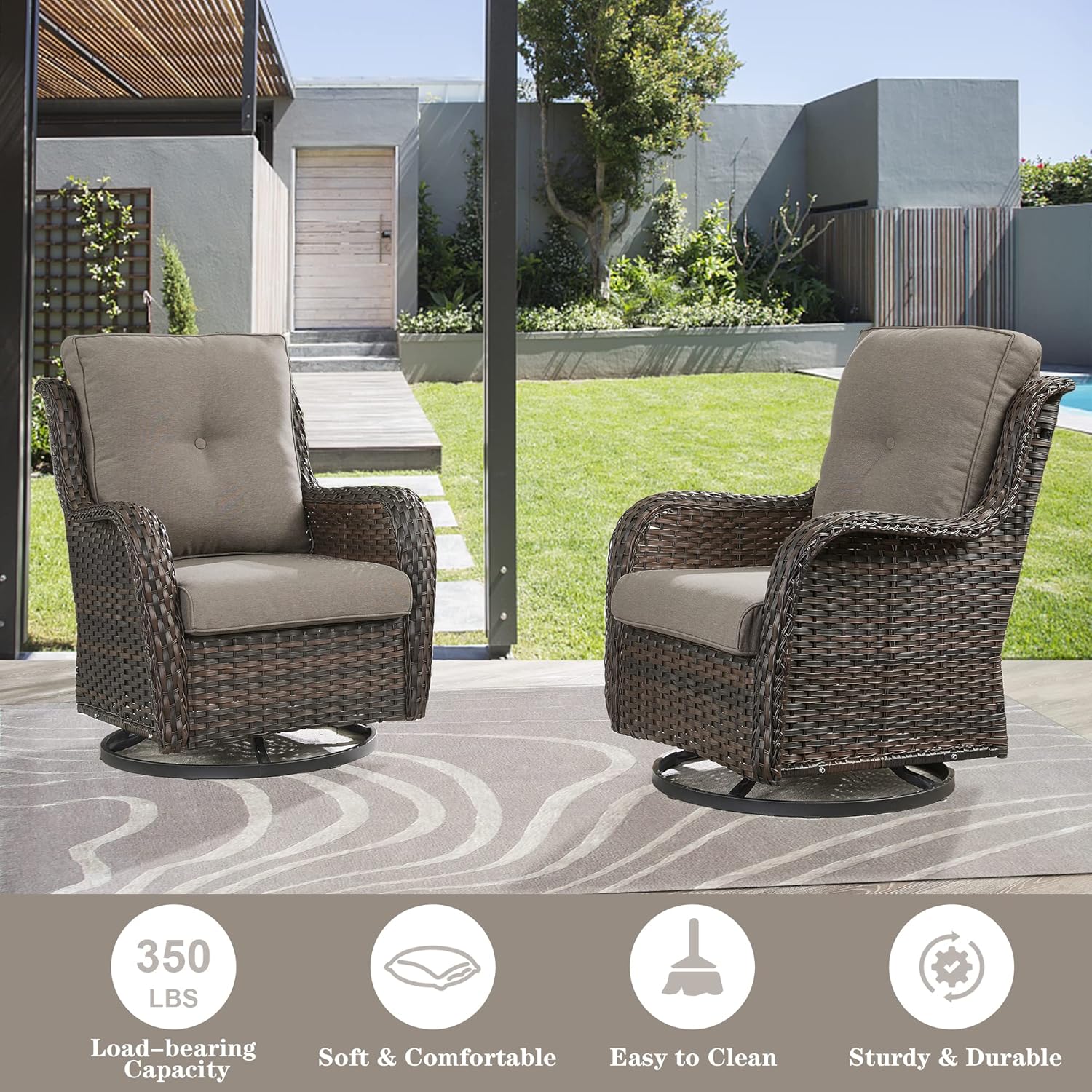 - Patio Furniture Set Introduction: The 5-piece patio furniture set includes 2 swivel glider chairs, 2 ottoman and a loveseat, ottoman can not only be used to relax your legs, but also can be used as a small table or small stool. The swivel chairs can hold up to 350 pounds.
