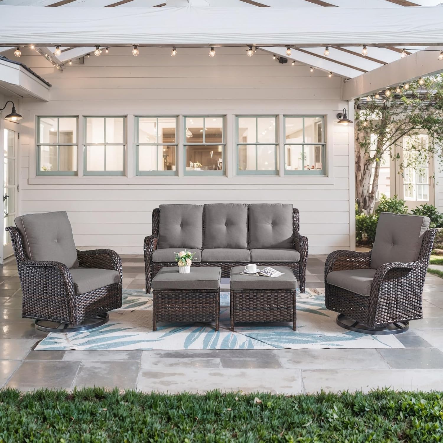 - Patio Furniture Set Introduction: The 5-piece patio furniture set includes 2 swivel glider chairs, 2 ottoman and a sofa, ottoman can not only be used to relax your legs, but also can be used as a small table or small stool. The swivel chairs can hold up to 350 pounds.