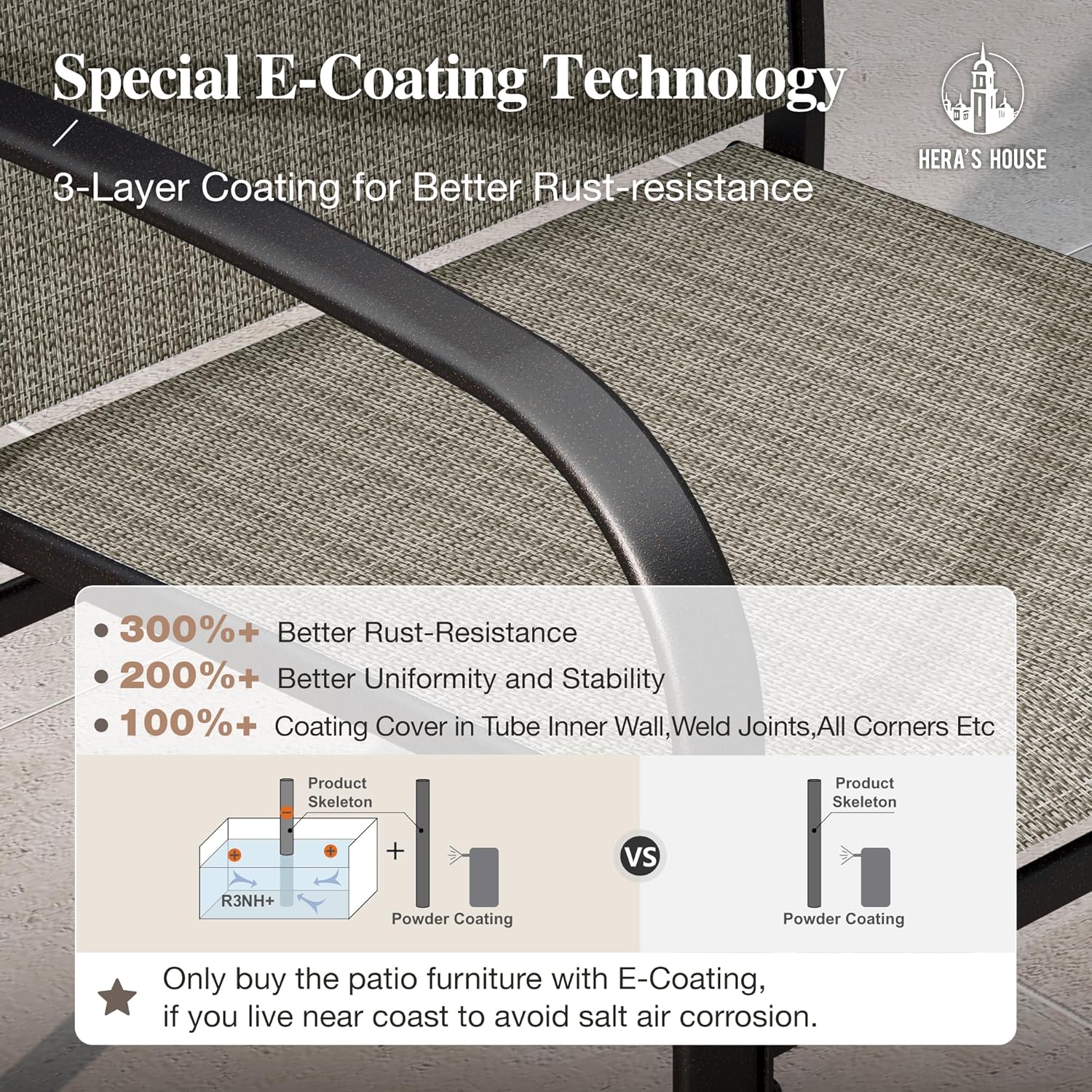 - ăALL WEATHER PATIO DINING SETSăThe outdoor table and chairs are built to last with high-performance E-Coated& Powder-Coated Steel that resists rust, fading, cracking, rotting, denting, and peeling, scratches, which is very durable and can withstand the test of outdoor environments