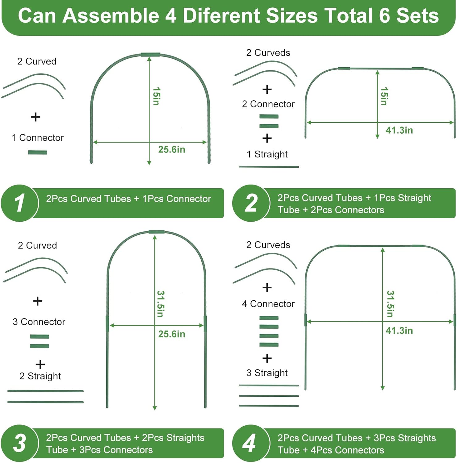 - š±ćGreenhouse Hoops DIY Kit Includeć: Garden Bed Hoops contains 16 curved tubes, 24pcs Stright Hoops,32 pcs connecting pipes and 24pcs clips (a total of 8 sets of greenhouse hoops 41.3" in Wide, 31.5" Height) You can combine with hoops to DIY your own grow tunnel, it can be DIY 4 Different Types.And you can use the clips to fix the greenhouse covering.