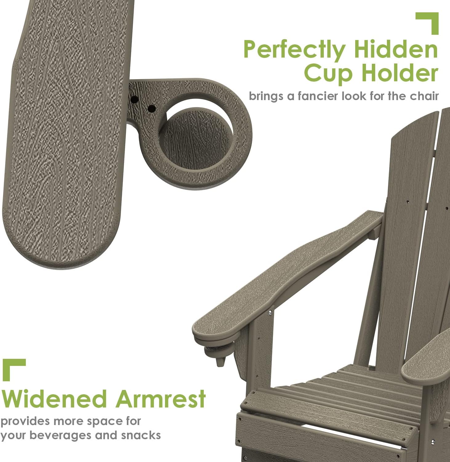 - 【Ergonomic & Foldable】 GreenVines Folding Adirondack chair features a hidden cup holder in the right arm, offering ample space for drinks or media devices. The reclined legs are designed for stability without the need for pins or chains. Easily foldable, this chair is perfect for storage at home or for taking on road trips. The slatted seating ensures quick drying after rain, while trimmed edges enhance safety for you and your family