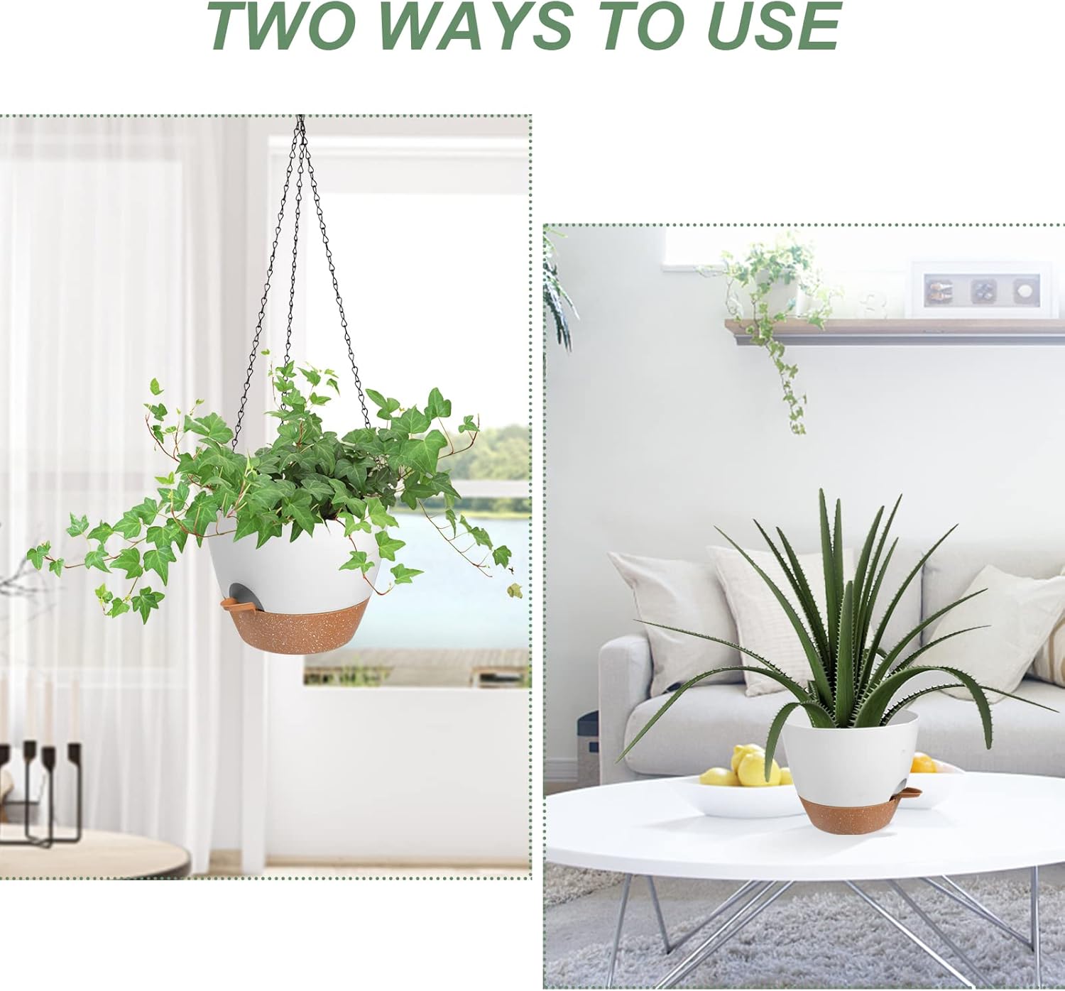 - Removable Trays - Hanging pots for plants indoor tray can be removed as a reservoir for self-watering, where excess water from the self-watering plant pots is drained into the tray, which stores a certain amount of water for the plants (7-14 days). You don't have to worry about your plants running out of water when you're away on a business trip or traveling.