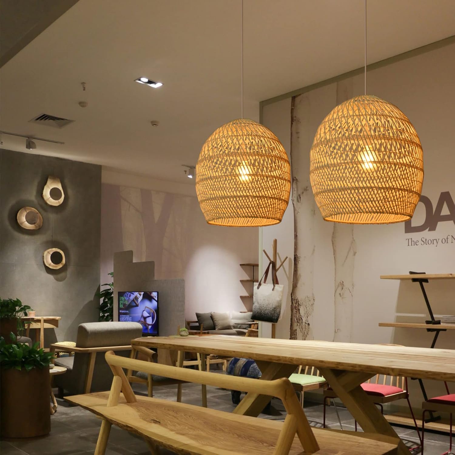 - RATTAN WOVEN: Crafted from handwoven rattan, this pendant lamp features a classic,intricately woven basket design. Its minimalist style brings artistic charm and modern elegance to your space.When lit,it emits a warm glow that creates a cozy and inviting atmosphere.