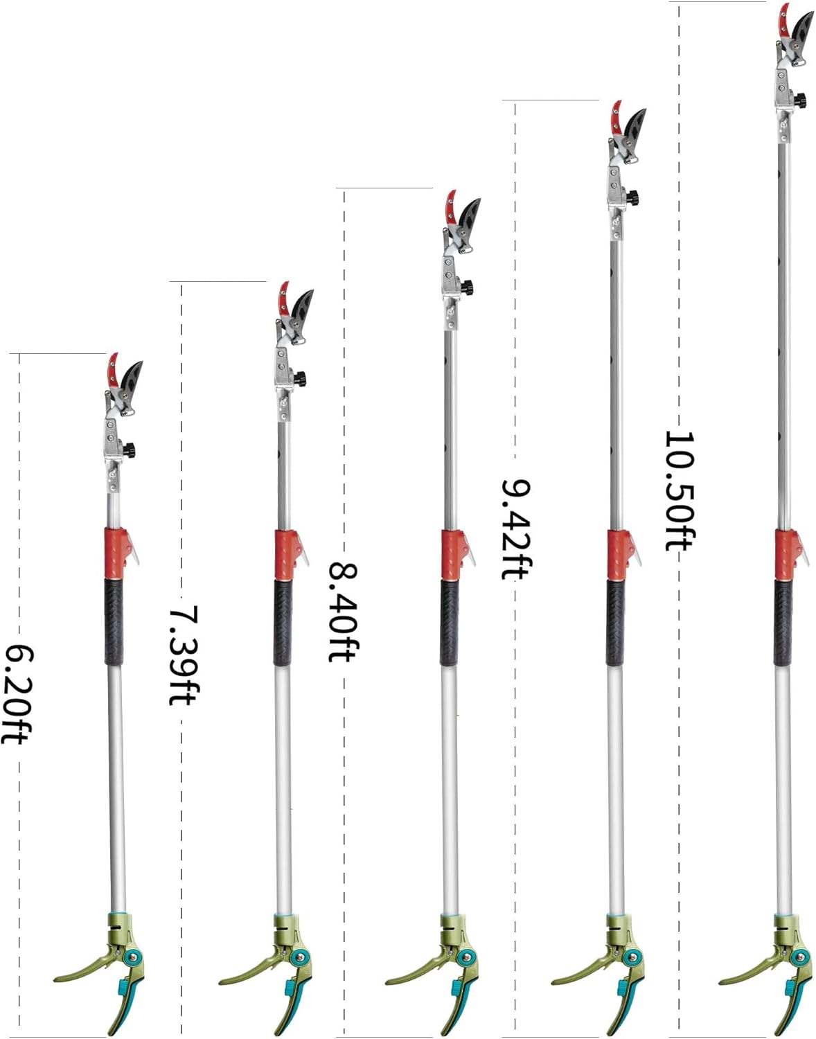 - [Helpful Garden Tool] GARTOL lightweight pruning tool with a long reach capability of 6.23-10.5 feet (76.7-126 inches). For gardening lovers, this pruner which resolves mobility issues and gives you the pleasure of trimming your garden without bending down or using a ladder to climb and cut it. You can conveniently get across other plants to remove the fastgrowing brambles and sting nettles without getting scratched or hurt.