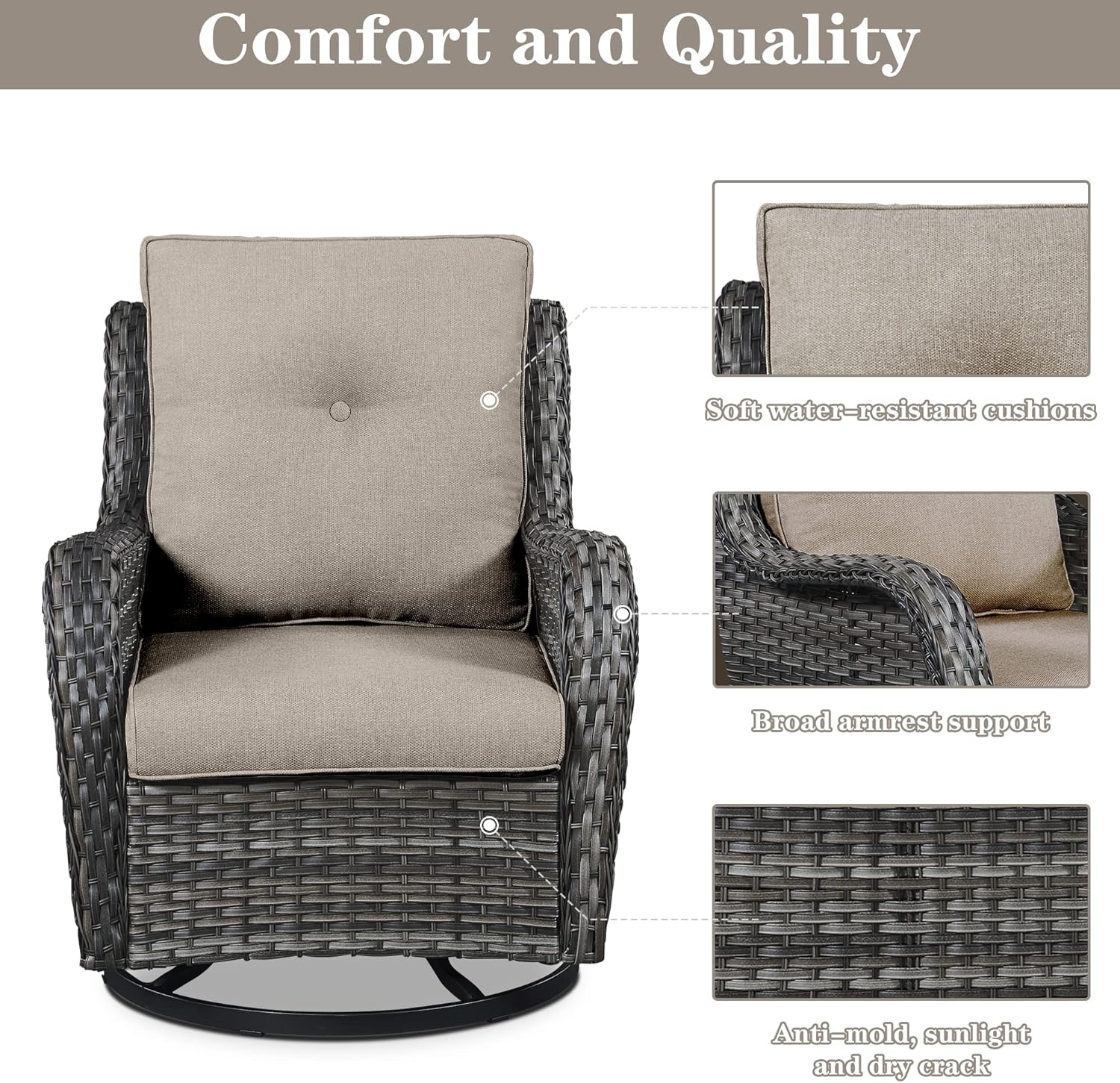 - Comfortable And Easy To Clean: Each glider chair and sofa in this outdoor set comes with a 4-inch thick foam seat cushion and an 8-inch thick cotton back cushion, which is ergonomic and enhances the overall comfort of the chair. The chair cushion cover is made of outdoor professional olefin fabric which is water resistant, and the seat cushion is equipped with zippers that are removable and easy to clean.